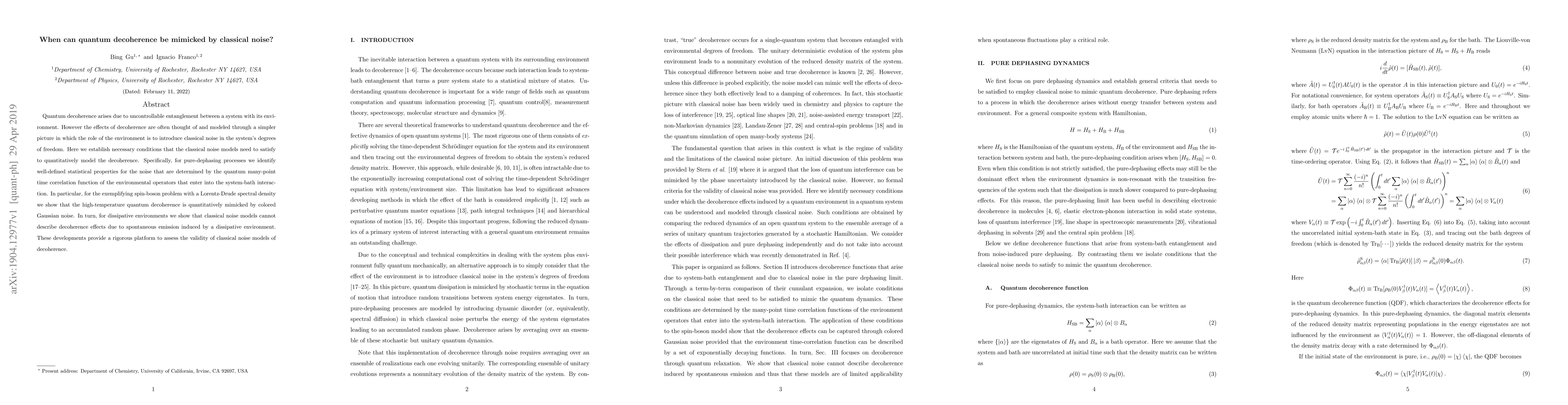 This paper establishes conditions for classical noise to mimic quantum decoherence, identifying statistical properties of noise that match quantum many-point time correlation functions. It demonstrates that high-temperature decoherence in the spin-boson model can be mimicked by colored Gaussian noise, but classical noise cannot replicate decoherence from spontaneous emission in dissipative environments.