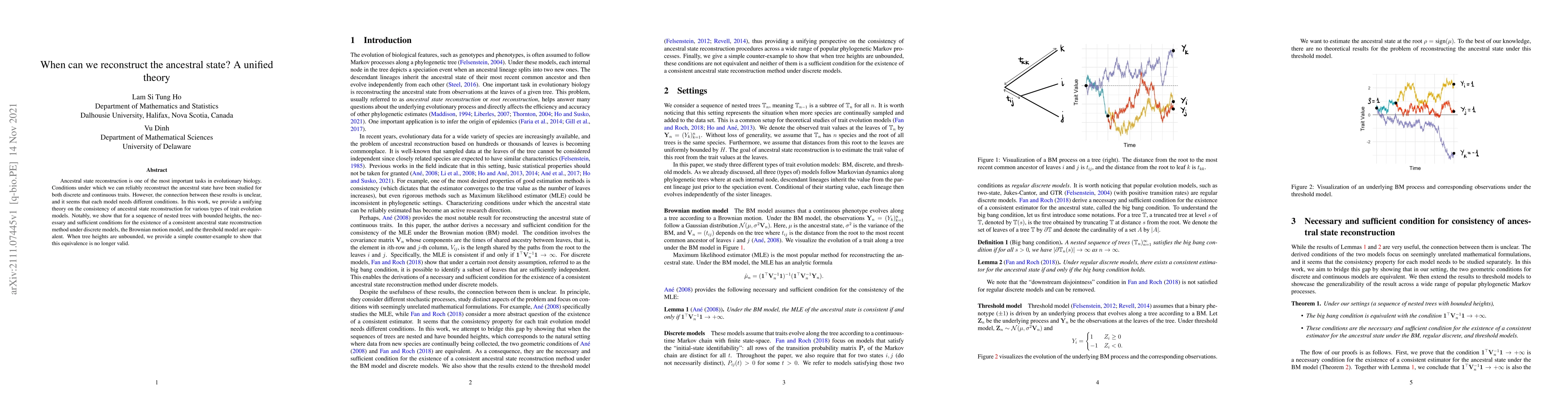 This paper presents a unifying theory for the consistency of ancestral state reconstruction across different evolutionary models, showing that under bounded tree heights, the conditions for reconstruction are equivalent for discrete, Brownian motion, and threshold models. However, when tree heights are unbounded, these conditions diverge, as demonstrated by a provided counter-example.