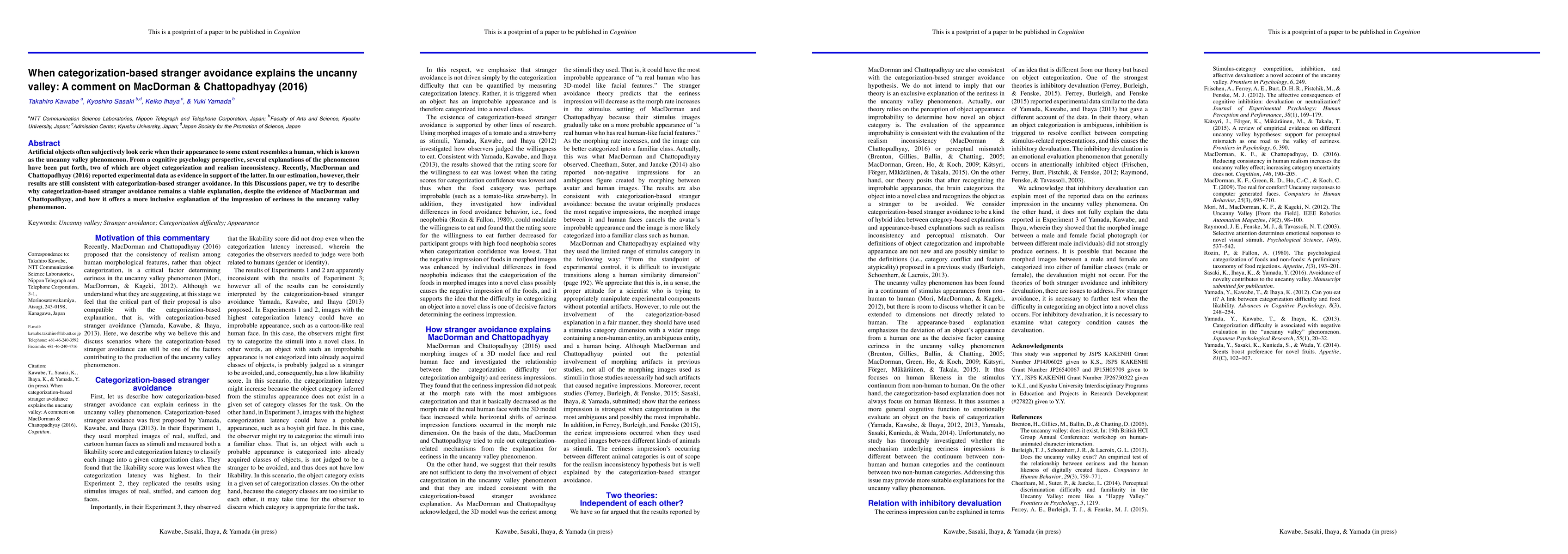 Artificial objects often subjectively look eerie when their appearance to some extent resembles a human, which is known as the uncanny valley phenomenon. From a cognitive psychology perspective, several explanations of the phenomenon have been put forth, two of which are object categorization and realism inconsistency. Recently, MacDorman and Chattopadhyay (2016) reported experimental data as evidence in support of the latter. In our estimation, however, their results are still consistent with categorization-based stranger avoidance. In this Discussions paper, we try to describe why categorization-based stranger avoidance remains a viable explanation, despite the evidence of MacDorman and Chattopadhyay, and how it offers a more inclusive explanation of the impression of eeriness in the uncanny valley phenomenon.