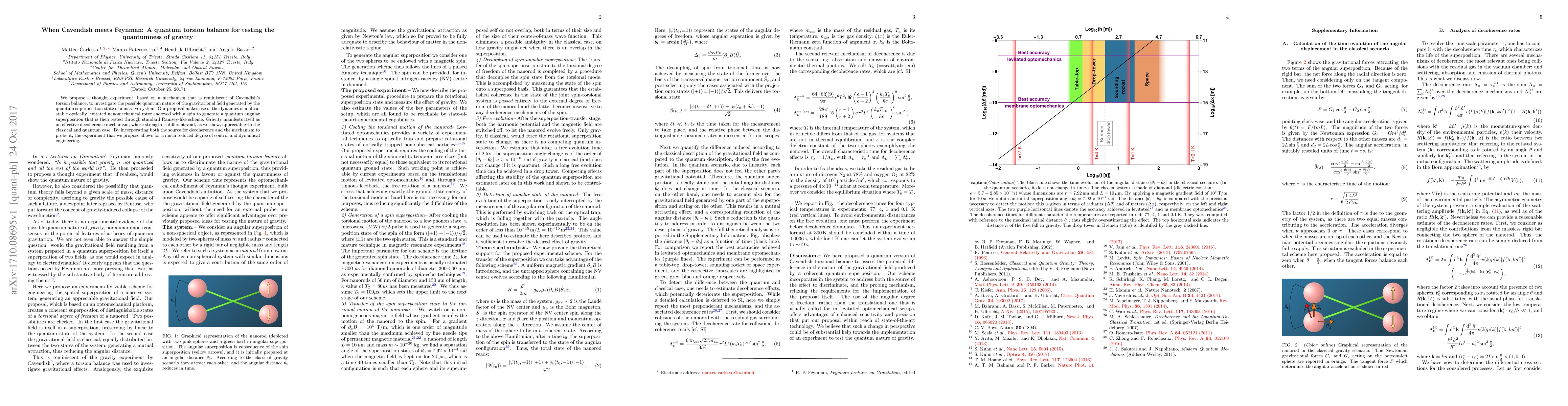 We propose a thought experiment, based on a mechanism that is reminiscent of Cavendish's torsion balance, to investigate the possible quantum nature of the gravitational field generated by the quantum superposition state of a massive system. Our proposal makes use of the dynamics of a ultra-stable optically levitated nanomechanical rotor endowed with a spin to generate a quantum angular superposition that is then tested through standard Ramsey-like scheme. Gravity manifests itself as an effective decoherence mechanism, whose strength is different-and, as we show, appreciable-in the classical and quantum case. By incorporating both the source for decoherence and the mechanism to probe it, the experiment that we propose allows for a much reduced degree of control and dynamical engineering.