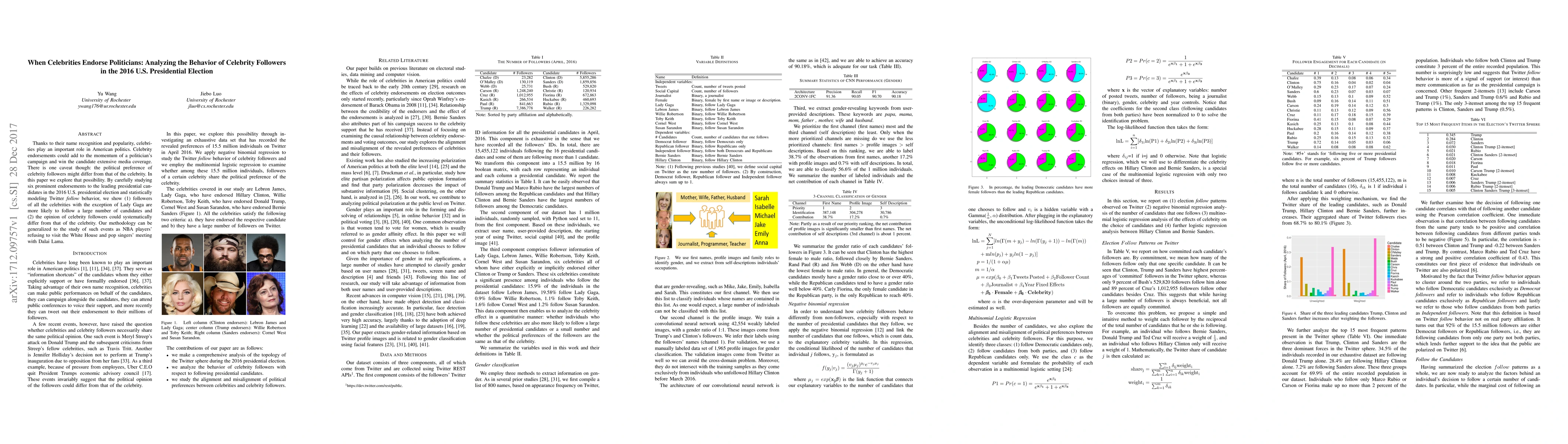 This paper examines how celebrity endorsements influence the political behavior of their followers during the 2016 U.S. presidential election, revealing that followers often diverge in political preference from the celebrities. The study uses Twitter data to show that, except for Lady Gaga, celebrity followers tend to follow a diverse range of political candidates.