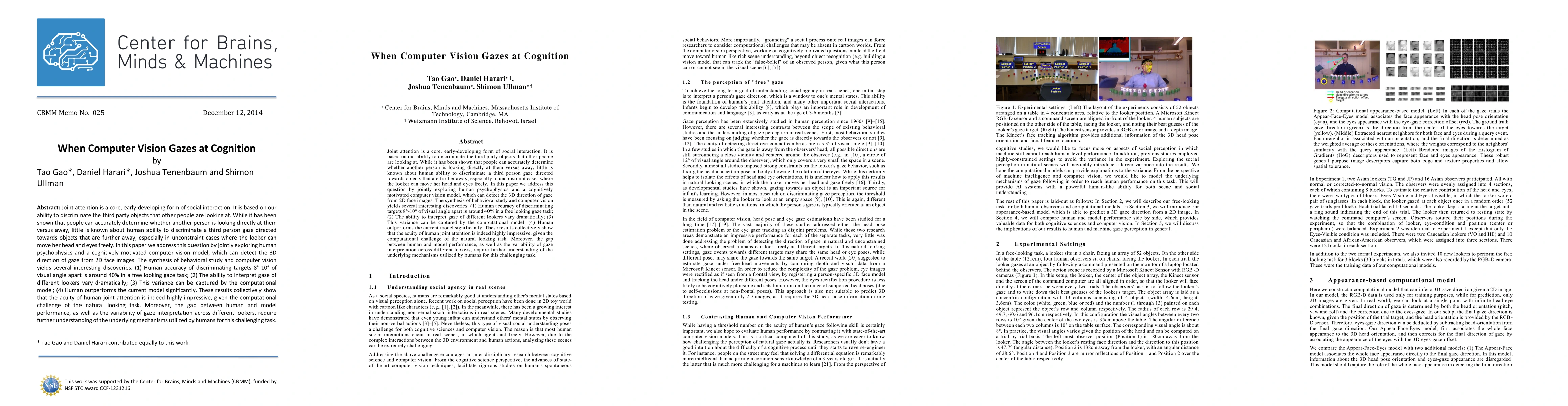 Joint attention is a core, early-developing form of social interaction. It is based on our ability to discriminate the third party objects that other people are looking at. While it has been shown that people can accurately determine whether another person is looking directly at them versus away, little is known about human ability to discriminate a third person gaze directed towards objects that are further away, especially in unconstraint cases where the looker can move her head and eyes freely. In this paper we address this question by jointly exploring human psychophysics and a cognitively motivated computer vision model, which can detect the 3D direction of gaze from 2D face images. The synthesis of behavioral study and computer vision yields several interesting discoveries. (1) Human accuracy of discriminating targets 8{\deg}-10{\deg} of visual angle apart is around 40% in a free looking gaze task; (2) The ability to interpret gaze of different lookers vary dramatically; (3) This variance can be captured by the computational model; (4) Human outperforms the current model significantly. These results collectively show that the acuity of human joint attention is indeed highly impressive, given the computational challenge of the natural looking task. Moreover, the gap between human and model performance, as well as the variability of gaze interpretation across different lookers, require further understanding of the underlying mechanisms utilized by humans for this challenging task.