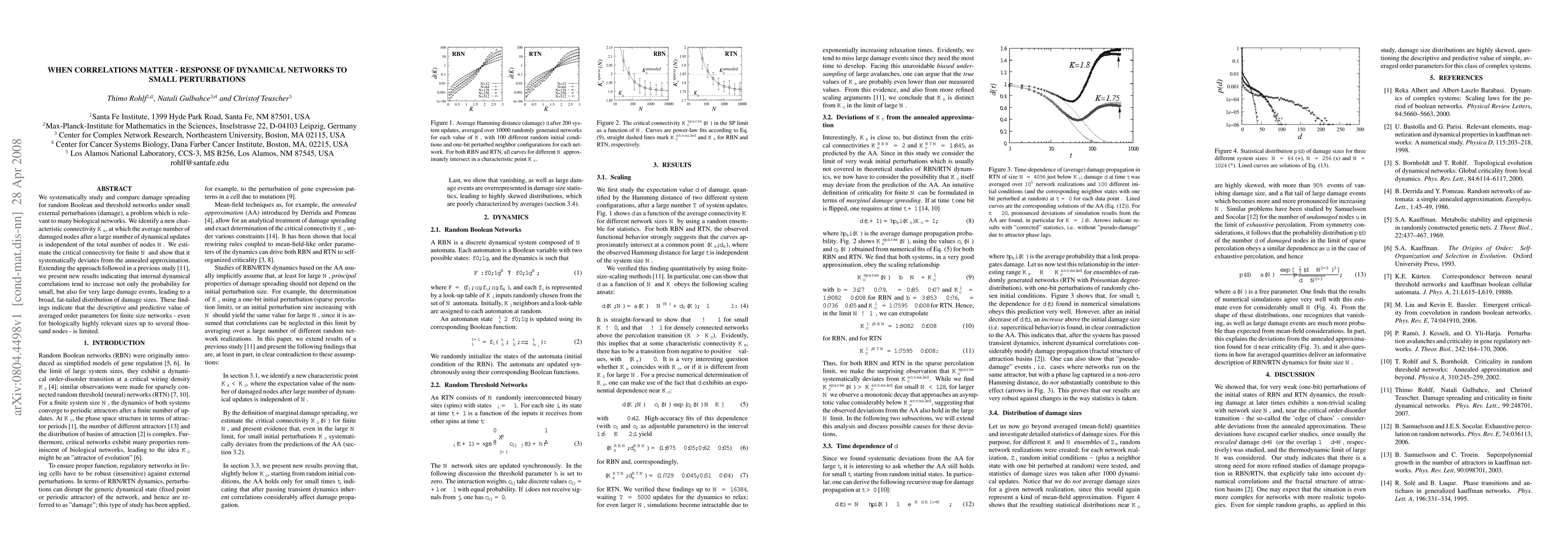 This paper investigates how random Boolean and threshold networks respond to small perturbations, identifying a new characteristic connectivity $K_s$ where damage spreading is independent of the network size. It reveals that internal dynamical correlations increase the likelihood of both small and large damage events, resulting in a broad, fat-tailed distribution of damage sizes, which limits the predictive power of averaged order parameters for finite networks.