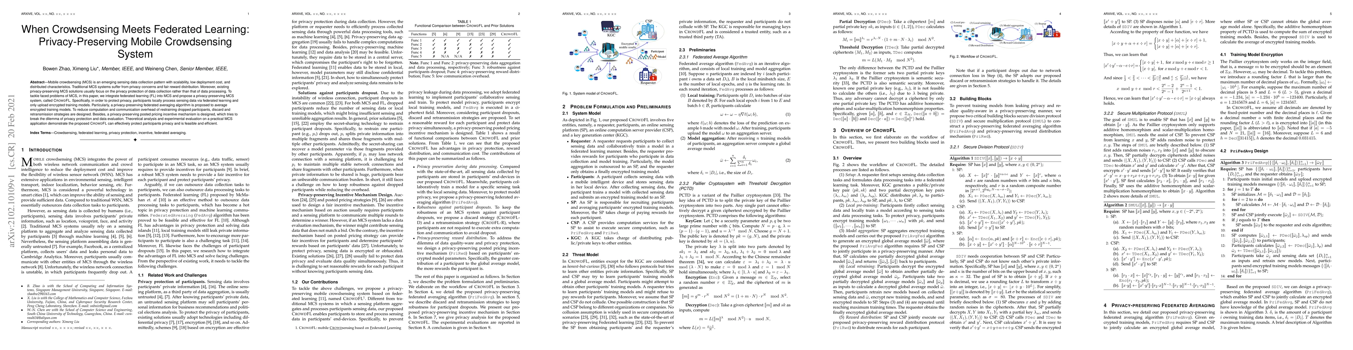 This paper proposes a privacy-preserving mobile crowdsensing system called CrowdFL, integrating federated learning to ensure participants' data privacy during both collection and processing. It uses encrypted training models and innovative incentive mechanisms to balance privacy and data evaluation.