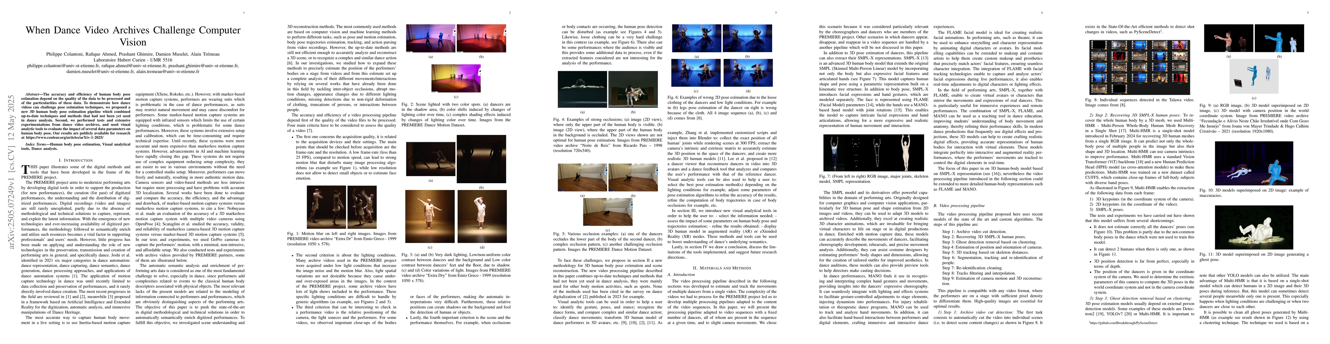 This research is important as it highlights the unique challenges dance videos pose to computer vision and provides a new estimation pipeline, which can impact future developments in human motion analysis across various fields.