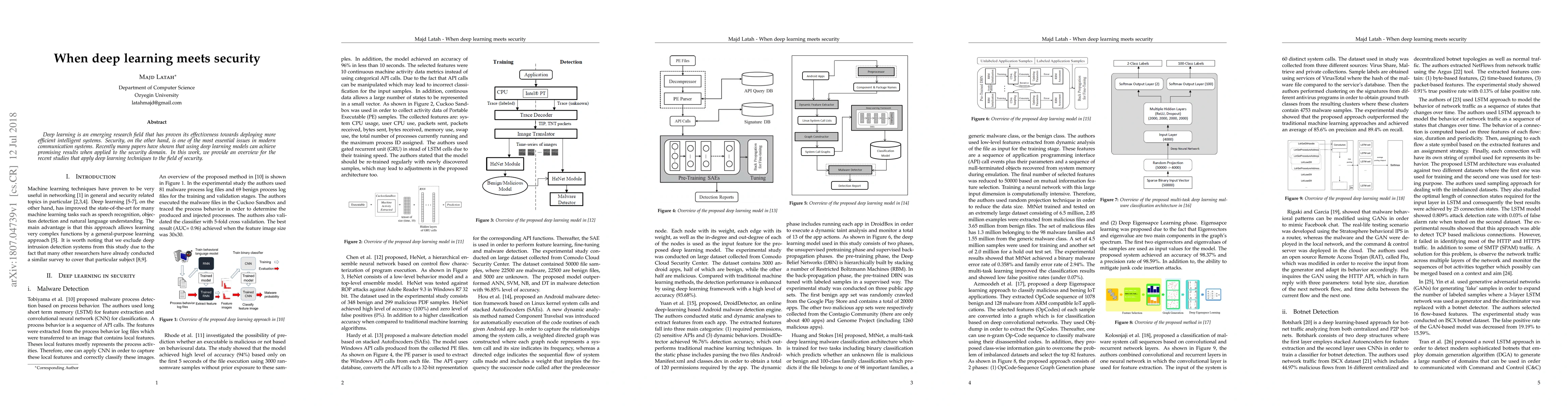 Deep learning is an emerging research field that has proven its effectiveness towards deploying more efficient intelligent systems. Security, on the other hand, is one of the most essential issues in modern communication systems. Recently many papers have shown that using deep learning models can achieve promising results when applied to the security domain. In this work, we provide an overview for the recent studies that apply deep learning techniques to the field of security.