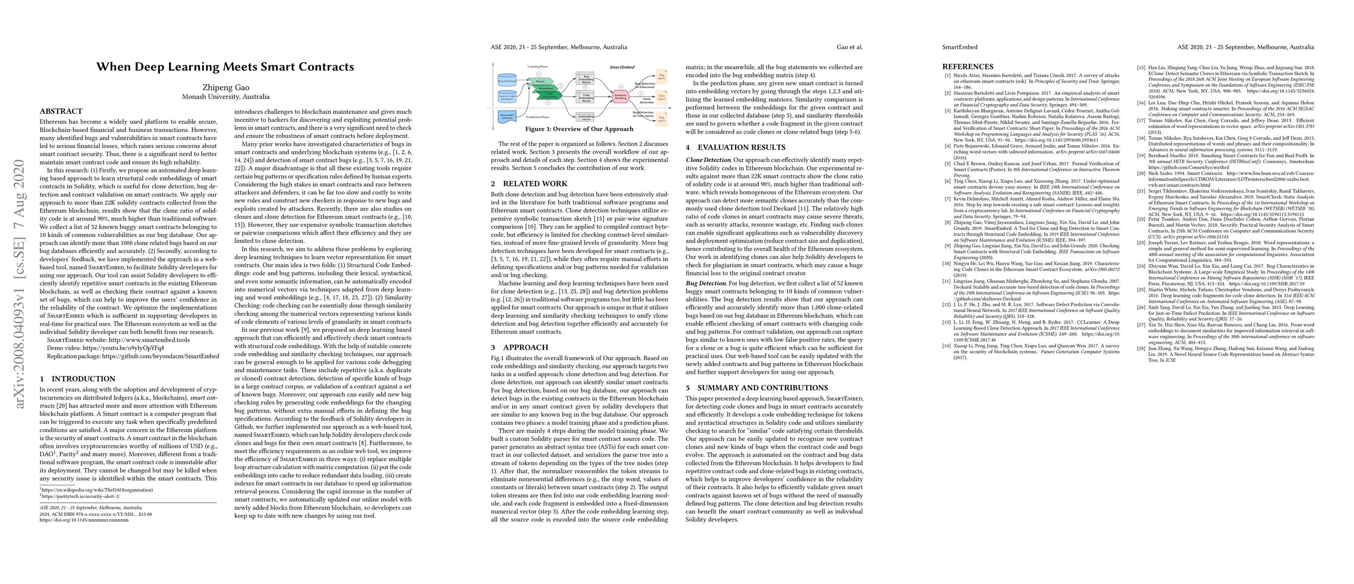 This research proposes a deep learning-based approach to enhance smart contract security on Ethereum by automating the detection of code clones and bugs in Solidity contracts. The approach, implemented in a web-based tool called SmartEmbed, identifies over 1000 clone-related bugs and supports real-time analysis, thereby improving the reliability and trustworthiness of smart contracts.