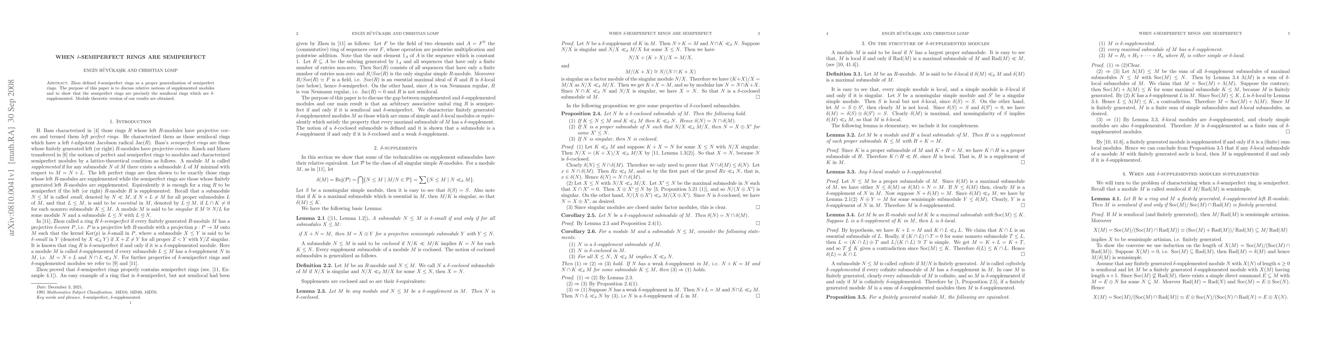 Zhou defined $\delta$-semiperfect rings as a proper generalization of semiperfect rings. The purpose of this paper is to discuss relative notions of supplemented modules and to show that the semiperfect rings are precisely the semilocal rings which are $\delta$-supplemented. Module theoretic version of our results are obtained.