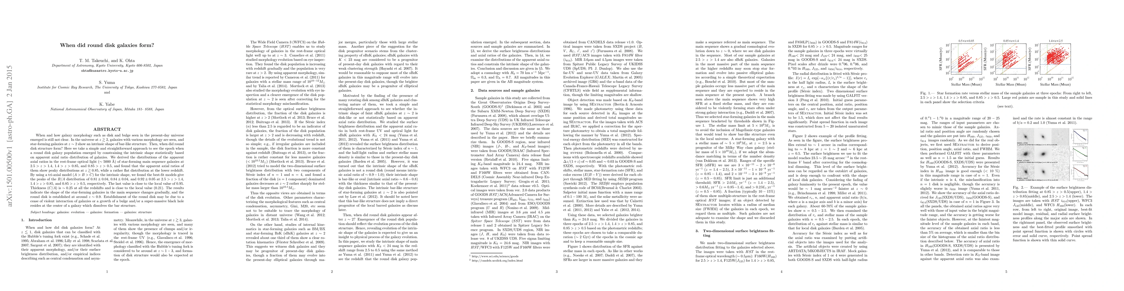 This research investigates the emergence of round disk galaxies by analyzing the axial ratio distribution of star-forming galaxies at different redshifts. The study finds that the round disk structure likely formed around $z\sim0.9$, suggesting a gradual morphological change due to reduced galaxy interactions or the growth of central bulges and supermassive black holes.