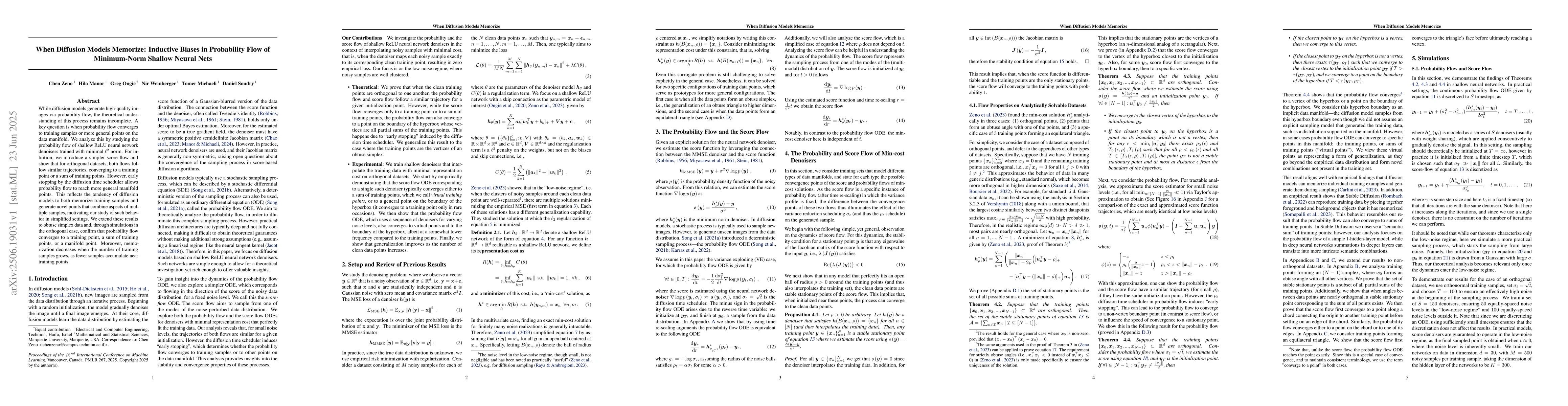 While diffusion models generate high-quality images via probability flow, the theoretical understanding of this process remains incomplete. A key question is when probability flow converges to training samples or more general points on the data manifold. We analyze this by studying the probability flow of shallow ReLU neural network denoisers trained with minimal $\ell^2$ norm. For intuition, we introduce a simpler score flow and show that for orthogonal datasets, both flows follow similar trajectories, converging to a training point or a sum of training points. However, early stopping by the diffusion time scheduler allows probability flow to reach more general manifold points. This reflects the tendency of diffusion models to both memorize training samples and generate novel points that combine aspects of multiple samples, motivating our study of such behavior in simplified settings. We extend these results to obtuse simplex data and, through simulations in the orthogonal case, confirm that probability flow converges to a training point, a sum of training points, or a manifold point. Moreover, memorization decreases when the number of training samples grows, as fewer samples accumulate near training points.