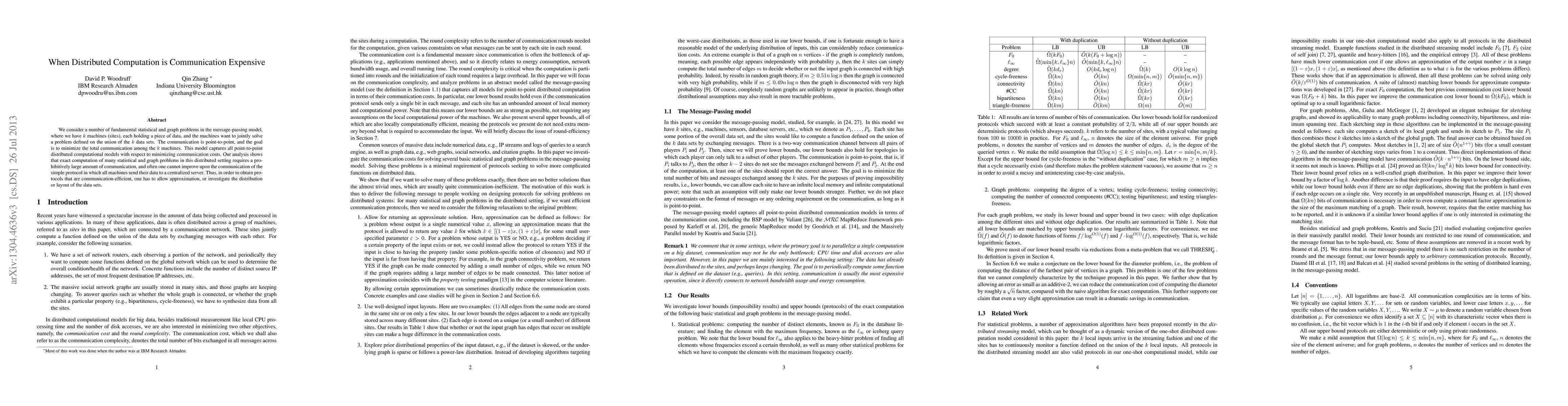 We consider a number of fundamental statistical and graph problems in the message-passing model, where we have $k$ machines (sites), each holding a piece of data, and the machines want to jointly solve a problem defined on the union of the $k$ data sets. The communication is point-to-point, and the goal is to minimize the total communication among the $k$ machines. This model captures all point-to-point distributed computational models with respect to minimizing communication costs. Our analysis shows that exact computation of many statistical and graph problems in this distributed setting requires a prohibitively large amount of communication, and often one cannot improve upon the communication of the simple protocol in which all machines send their data to a centralized server. Thus, in order to obtain protocols that are communication-efficient, one has to allow approximation, or investigate the distribution or layout of the data sets.