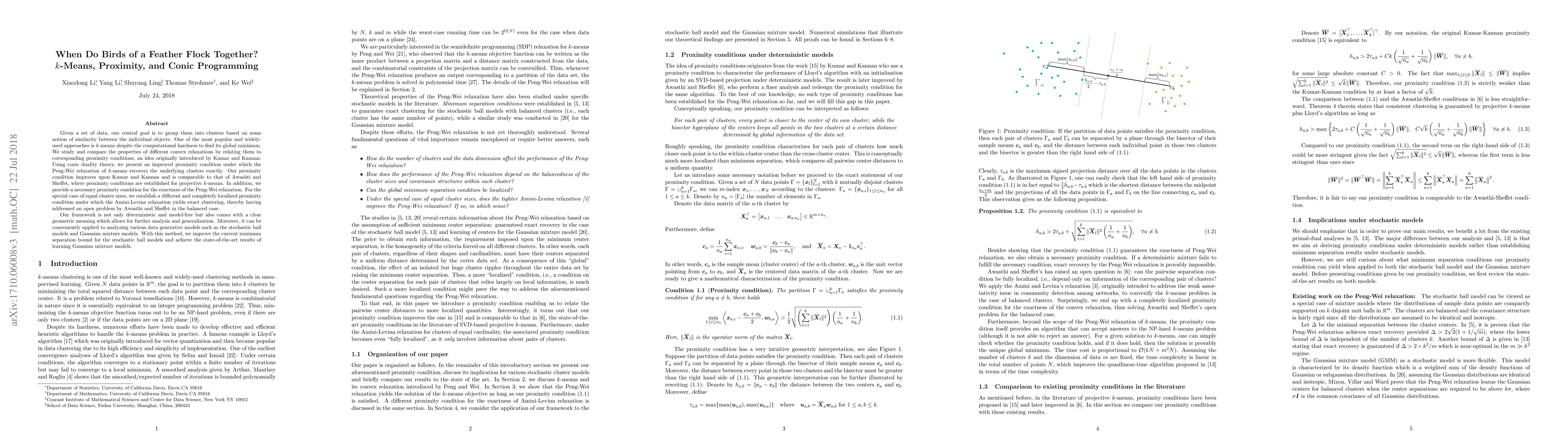 This paper investigates the k-means clustering algorithm and its convex relaxations, proposing improved proximity conditions for exact cluster recovery. It leverages conic duality theory to enhance the Peng-Wei relaxation and addresses open problems regarding balanced clustering, achieving state-of-the-art results for learning Gaussian mixture models.