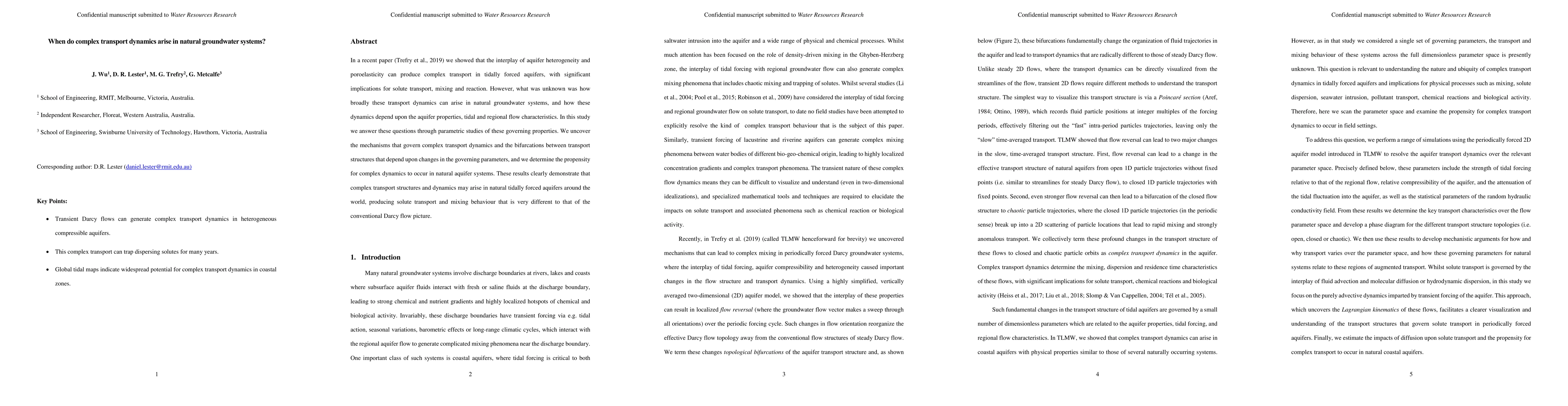 In a recent paper (Trefry et al., 2019) we showed that the interplay of aquifer heterogeneity and poroelasticity can produce complex transport in tidally forced aquifers, with significant implications for solute transport, mixing and reaction. However, what was unknown was how broadly these transport dynamics can arise in natural groundwater systems, and how these dynamics depend upon the aquifer properties, tidal and regional flow characteristics. In this study we answer these questions through parametric studies of these governing properties. We uncover the mechanisms that govern complex transport dynamics and the bifurcations between transport structures with changes in the governing parameters, and we determine the propensity for complex dynamics to occur in natural aquifer systems. These results clearly demonstrate that complex transport structures and dynamics may arise in natural tidally forced aquifers around the world, producing solute transport and mixing behaviour that is very different to that of the conventional Darcy flow picture. Key Points: * Transient Darcy flows can generate complex transport dynamics in heterogeneous compressible aquifers. * This complex transport can trap dispersing solutes for many years. * Global tidal maps indicate widespread potential for complex transport dynamics in coastal zones.