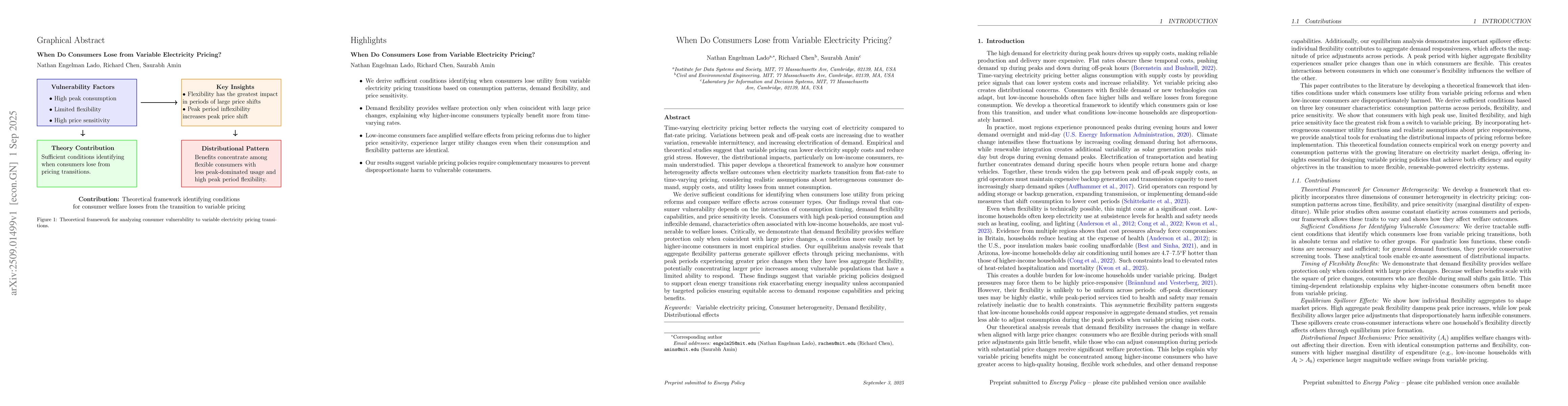 Time-varying electricity pricing better reflects the varying cost of electricity compared to flat-rate pricing. Variations between peak and off-peak costs are increasing due to weather variation, renewable intermittency, and increasing electrification of demand. Empirical and theoretical studies suggest that variable pricing can lower electricity supply costs and reduce grid stress. However, the distributional impacts, particularly on low-income consumers, remain understudied. This paper develops a theoretical framework to analyze how consume heterogeneity affects welfare outcomes when electricity markets transition from flat-rate to time-varying pricing, considering realistic assumptions about heterogeneous consumer demand, supply costs, and utility losses from unmet consumption. We derive sufficient conditions for identifying when consumers lose utility from pricing reforms and compare welfare effects across consumer types. Our findings reveal that consumer vulnerability depends on the interaction of consumption timing, demand flexibility capabilities, and price sensitivity levels. Consumers with high peak-period consumption and inflexible demand, characteristics often associated with low-income households, are most vulnerable to welfare losses. Critically, we demonstrate that demand flexibility provides welfare protection only when coincident with large price changes. Our equilibrium analysis reveals that aggregate flexibility patterns generate spillover effects through pricing mechanisms, with peak periods experiencing greater price changes when they have less aggregate flexibility, potentially concentrating larger price increases among vulnerable populations that have a limited ability to respond. These findings suggest that variable pricing policies should be accompanied by targeted policies ensuring equitable access to demand response capabilities and pricing benefits.