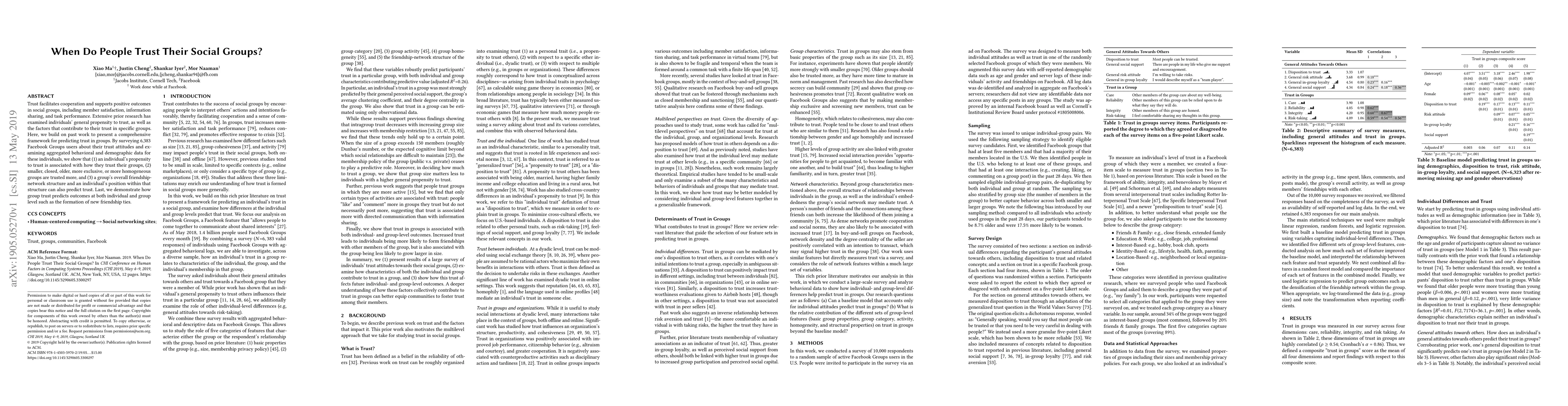Trust facilitates cooperation and supports positive outcomes in social groups, including member satisfaction, information sharing, and task performance. Extensive prior research has examined individuals' general propensity to trust, as well as the factors that contribute to their trust in specific groups. Here, we build on past work to present a comprehensive framework for predicting trust in groups. By surveying 6,383 Facebook Groups users about their trust attitudes and examining aggregated behavioral and demographic data for these individuals, we show that (1) an individual's propensity to trust is associated with how they trust their groups, (2) smaller, closed, older, more exclusive, or more homogeneous groups are trusted more, and (3) a group's overall friendship-network structure and an individual's position within that structure can also predict trust. Last, we demonstrate how group trust predicts outcomes at both individual and group level such as the formation of new friendship ties.