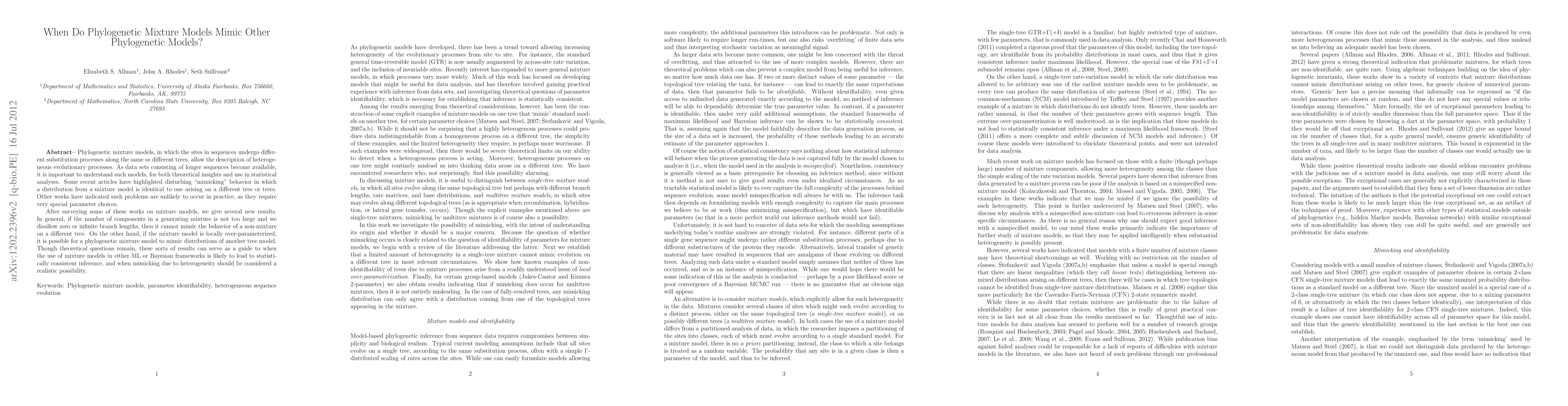 This paper investigates when phylogenetic mixture models can mimic the behavior of other phylogenetic models. It finds that under certain conditions, such as a limited number of components and non-zero branch lengths, mixture models do not mimic non-mixture models. However, local over-parameterization can lead to mimicking, providing guidance for consistent inference in statistical analyses.