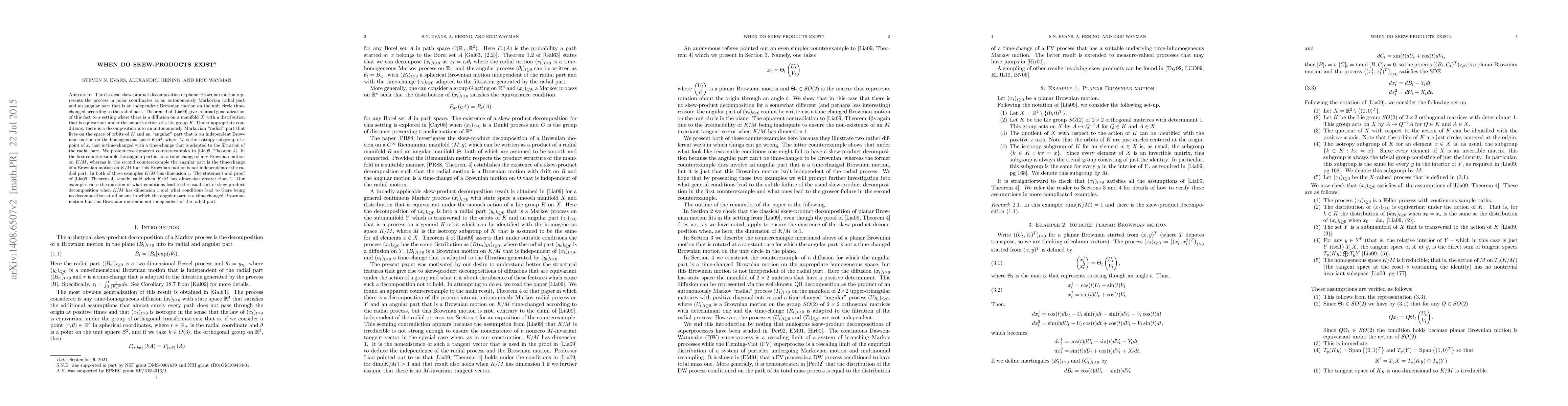 The classical skew-product decomposition of planar Brownian motion represents the process in polar coordinates as an autonomously Markovian radial part and an angular part that is an independent Brownian motion on the unit circle time-changed according to the radial part. Theorem 4 of Liao (2009) gives a broad generalization of this fact to a setting where there is a diffusion on a manifold $X$ with a distribution that is equivariant under the smooth action of a Lie group $K$. Under appropriate conditions, there is a decomposition into an autonomously Markovian "radial" part that lives on the space of orbits of $K$ and an "angular" part that is an independent Brownian motion on the homogeneous space $K/M$, where $M$ is the isotropy subgroup of a point of $x$, that is time-changed with a time-change that is adapted to the filtration of the radial part. We present two apparent counterexamples to Theorem 4 of Liao (2009). In the first counterexample the angular part is not a time-change of any Brownian motion on $K/M$, whereas in the second counterexample the angular part is the time-change of a Brownian motion on $K/M$ but this Brownian motion is not independent of the radial part. In both of these examples $K/M$ has dimension $1$. The statement and proof of Theorem 4 from Liao (2009) remain valid when $K/M$ has dimension greater than $1$. Our examples raise the question of what conditions lead to the usual sort of skew-product decomposition when $K/M$ has dimension $1$ and what conditions lead to there being no decomposition at all or one in which the angular part is a time-changed Brownian motion but this Brownian motion is not independent of the radial part.