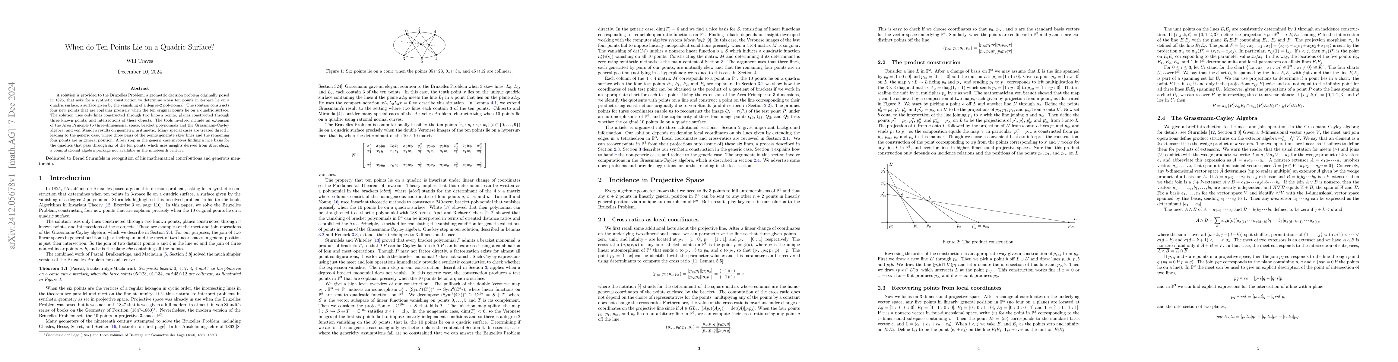 A solution is provided to the Bruxelles Problem, a geometric decision problem originally posed in 1825, that asks for a synthetic construction to determine when ten points in 3-space lie on a quadric surface, a surface given by the vanishing of a degree-2 polynomial. The solution constructs four new points that are coplanar precisely when the ten original points lie on a quadric surface. The solution uses only lines constructed through two known points, planes constructed through three known points, and intersections of these objects. The tools involved include an extension of the Area Principle to three-dimensional space, bracket polynomials and the Grassmann-Cayley algebra, and von Staudt's results on geometric arithmetic. Many special cases are treated directly, leading to the generic case, where three pairs of the points generate skew lines and the remaining four points are in general position. A key step in the generic case involves finding a nice basis for the quadrics that pass through six of the ten points, which uses insights derived from Macaulay2, a computational algebra package not available in the nineteenth century.