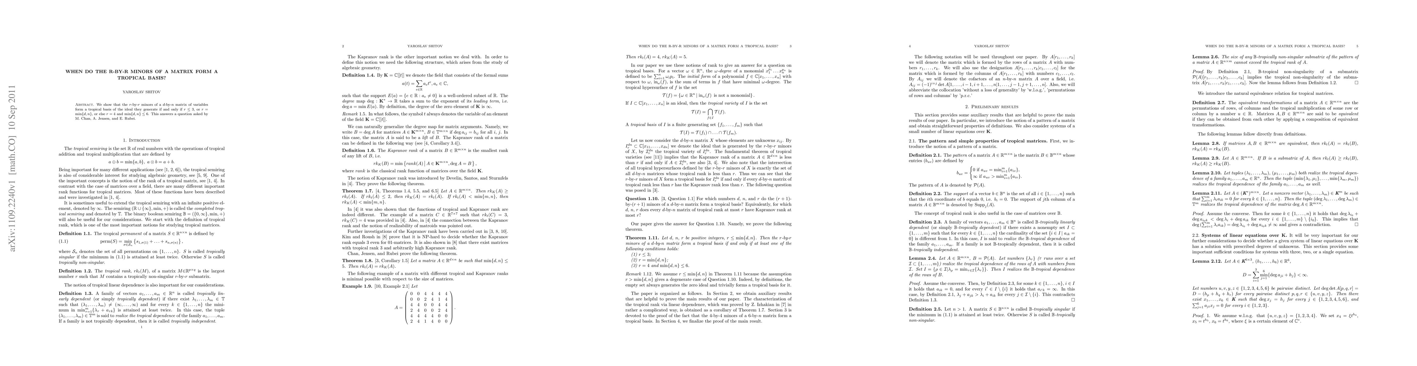 The paper establishes conditions under which r-by-r minors of a d-by-n matrix form a tropical basis, concluding that this occurs if r<4, r equals the minimum of d and n, or r=4 with min(d,n)<7. This resolves a query posed by M. Chan, A. Jensen, and E. Rubei.