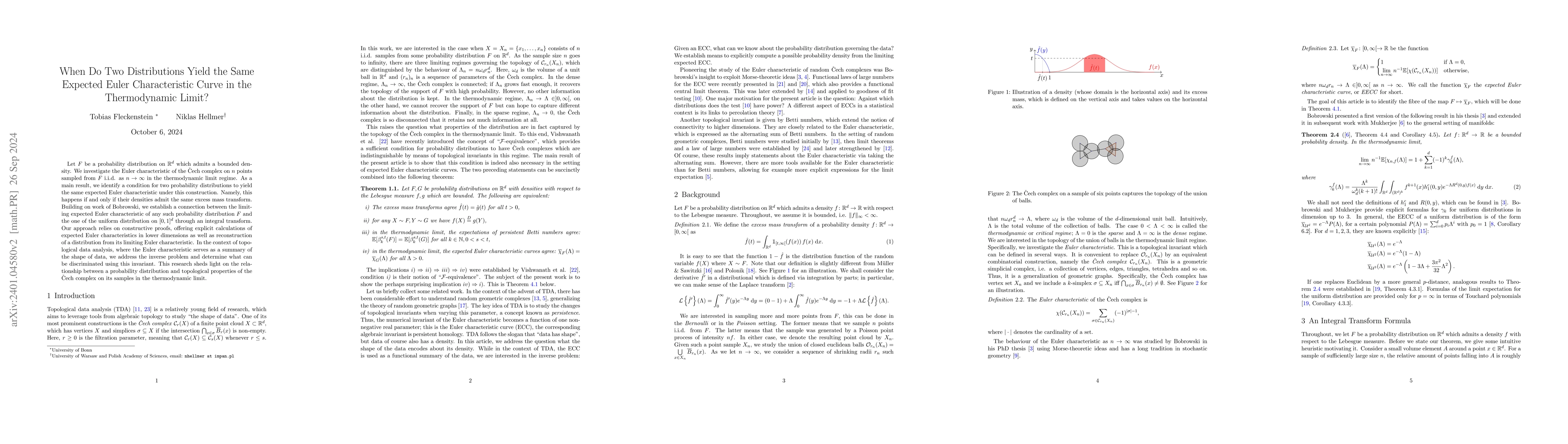 This paper investigates when two probability distributions yield the same expected Euler characteristic in the thermodynamic limit. It finds that this occurs if and only if the distributions have the same excess mass transform, providing constructive proofs and enabling new calculations in low dimensions.