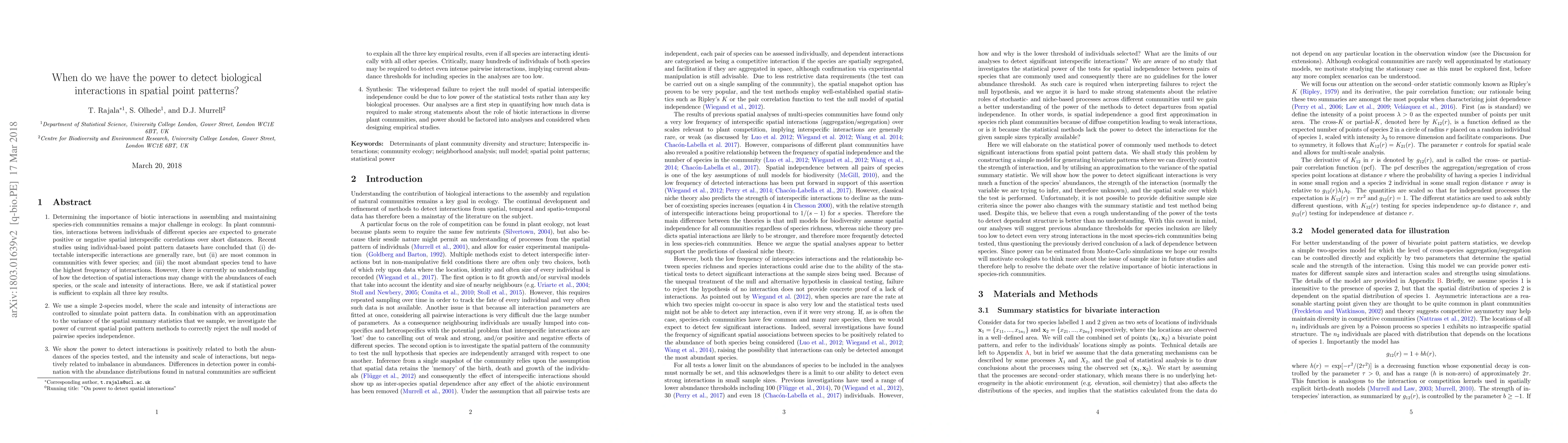 This paper investigates the factors influencing the ability to detect biological interactions in spatial point patterns, finding that detection power is positively related to species abundance, interaction intensity, and scale, while imbalanced abundances reduce detection power. It concludes that low detection power in species-rich communities may explain the higher frequency of detected interactions in less diverse communities.
