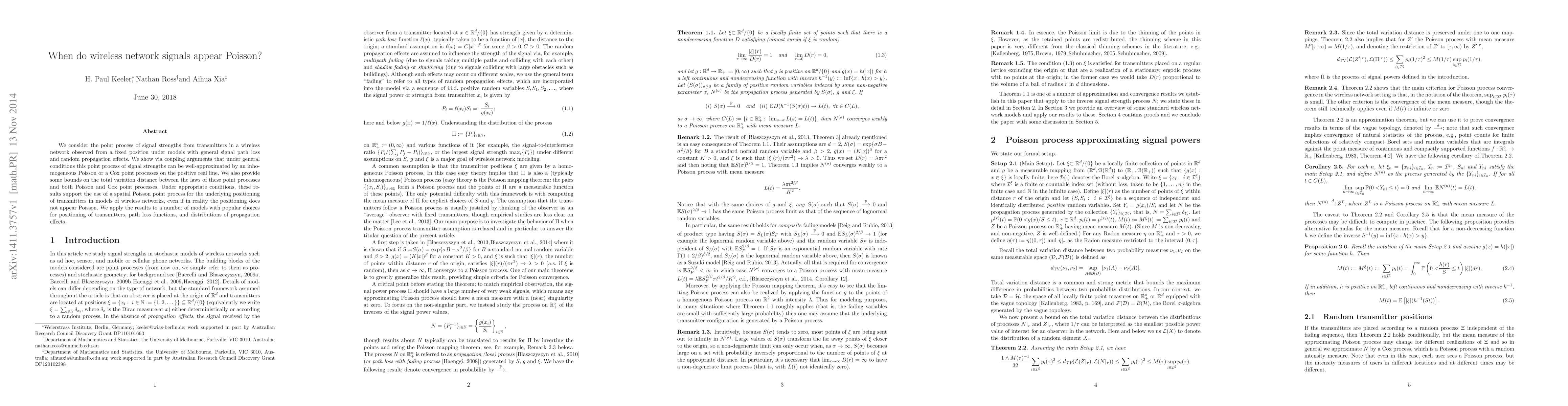 We consider the point process of signal strengths from transmitters in a wireless network observed from a fixed position under models with general signal path loss and random propagation effects. We show via coupling arguments that under general conditions this point process of signal strengths can be well-approximated by an inhomogeneous Poisson or a Cox point processes on the positive real line. We also provide some bounds on the total variation distance between the laws of these point processes and both Poisson and Cox point processes. Under appropriate conditions, these results support the use of a spatial Poisson point process for the underlying positioning of transmitters in models of wireless networks, even if in reality the positioning does not appear Poisson. We apply the results to a number of models with popular choices for positioning of transmitters, path loss functions, and distributions of propagation effects.