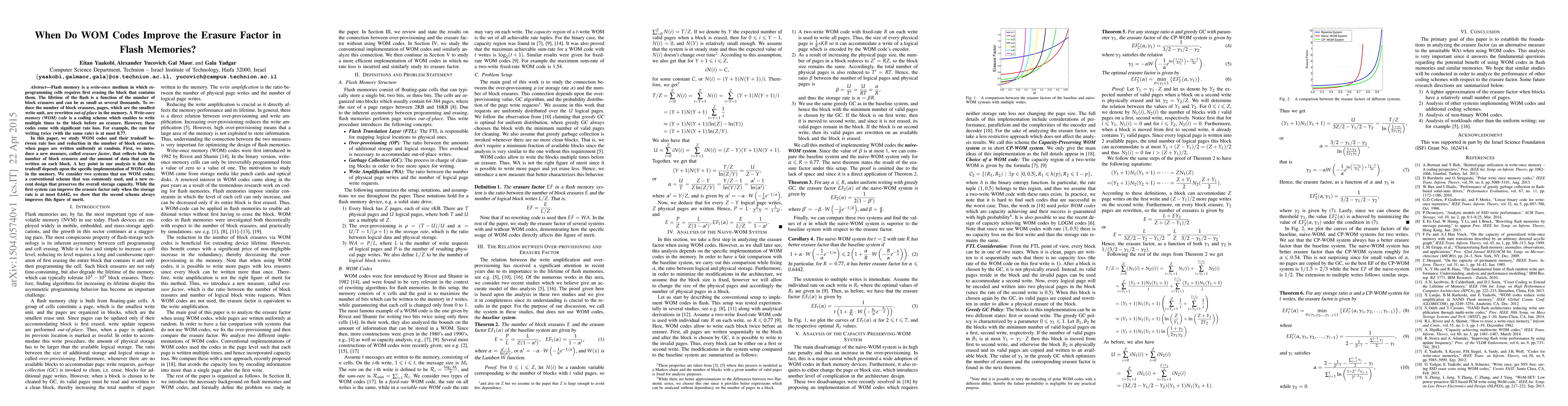 This paper investigates the effectiveness of Write-once memory (WOM) codes in reducing block erasures in flash memory, introducing a new "erasure factor" to measure both erasures and data write capacity. It compares two WOM code implementations, finding that while a conventional scheme improves the erasure factor only at lower storage rates, a newer design consistently enhances it.