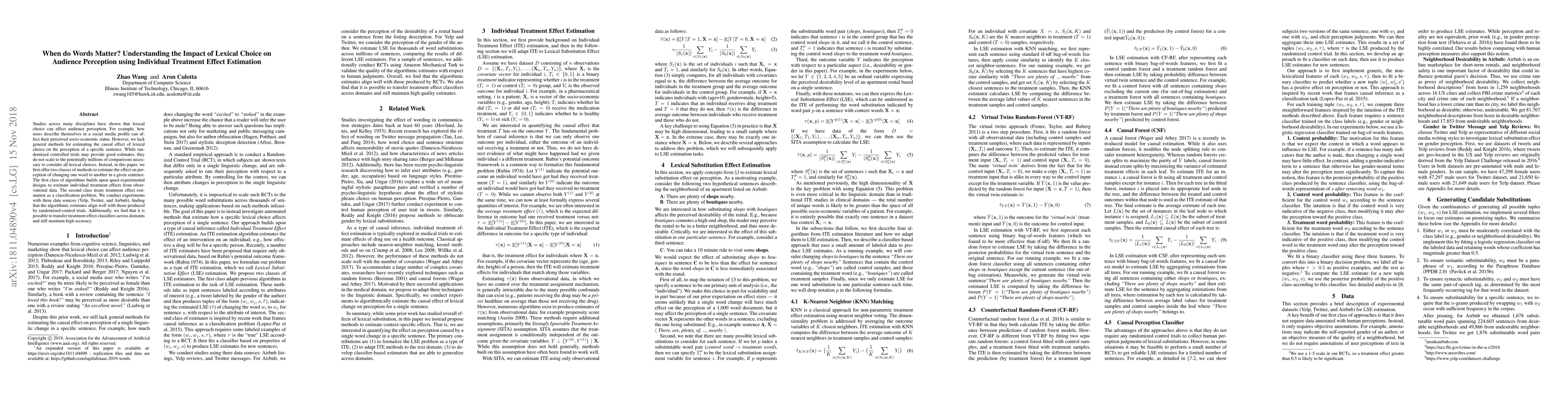 Studies across many disciplines have shown that lexical choice can affect audience perception. For example, how users describe themselves in a social media profile can affect their perceived socio-economic status. However, we lack general methods for estimating the causal effect of lexical choice on the perception of a specific sentence. While randomized controlled trials may provide good estimates, they do not scale to the potentially millions of comparisons necessary to consider all lexical choices. Instead, in this paper, we first offer two classes of methods to estimate the effect on perception of changing one word to another in a given sentence. The first class of algorithms builds upon quasi-experimental designs to estimate individual treatment effects from observational data. The second class treats treatment effect estimation as a classification problem. We conduct experiments with three data sources (Yelp, Twitter, and Airbnb), finding that the algorithmic estimates align well with those produced by randomized-control trials. Additionally, we find that it is possible to transfer treatment effect classifiers across domains and still maintain high accuracy.