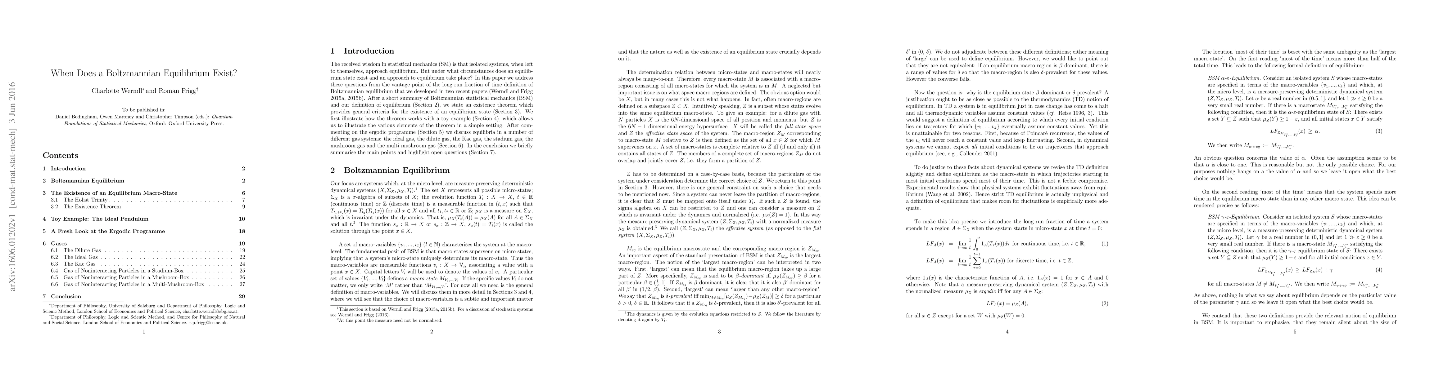 The received wisdom in statistical mechanics is that isolated systems, when left to themselves, approach equilibrium. But under what circumstances does an equilibrium state exist and an approach to equilibrium take place? In this paper we address these questions from the vantage point of the long-run fraction of time definition of Boltzmannian equilibrium that we developed in two recent papers (Werndl and Frigg 2015a, 2015b). After a short summary of Boltzmannian statistical mechanics and our definition of equilibrium, we state an existence theorem which provides general criteria for the existence of an equilibrium state. We first illustrate how the theorem works with a toy example, which allows us to illustrate the various elements of the theorem in a simple setting. After commenting on the ergodic programme, we discuss equilibria in a number of different gas systems: the ideal gas, the dilute gas, the Kac gas, the stadium gas, the mushroom gas and the multi-mushroom gas. In the conclusion we briefly summarise the main points and highlight open questions.