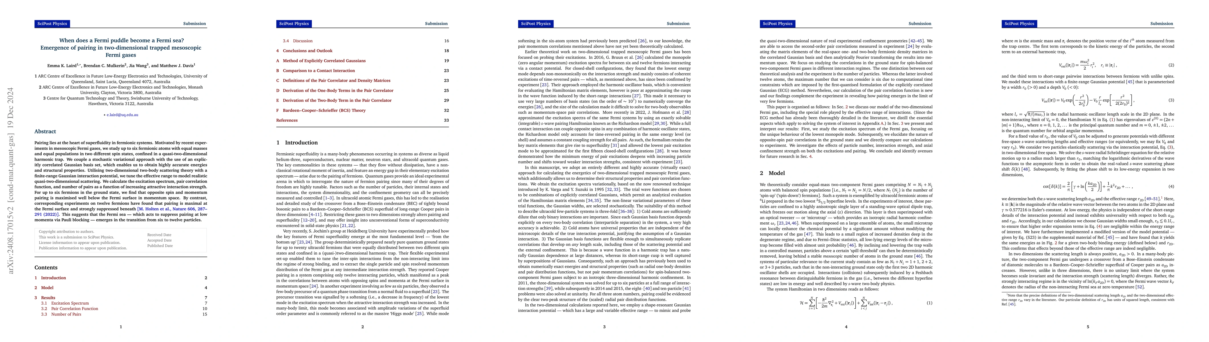 Pairing lies at the heart of superfluidity in fermionic systems. Motivated by recent experiments in mesoscopic Fermi gases, we study up to six fermionic atoms with equal masses and equal populations in two different spin states, confined in a quasi-two-dimensional harmonic trap. We couple a stochastic variational approach with the use of an explicitly correlated Gaussian basis set, which enables us to obtain highly accurate energies and structural properties. Utilising two-dimensional two-body scattering theory with a finite-range Gaussian interaction potential, we tune the effective range to model realistic quasi-two-dimensional scattering. We calculate the excitation spectrum, pair correlation function, and paired fraction as a function of increasing attractive interaction strength. For up to six fermions in the ground state, we find that opposite spin and momentum pairing is maximised well below the Fermi surface in momentum space. By contrast, corresponding experiments on twelve fermions have found that pairing is maximal at the Fermi surface and strongly suppressed beneath [M. Holten et al., Nature 606, 287-291 (2022)]. This suggests that the Fermi sea $-$ which acts to suppress pairing at low momenta through Pauli blocking $-$ emerges in the transition from six to twelve particles.