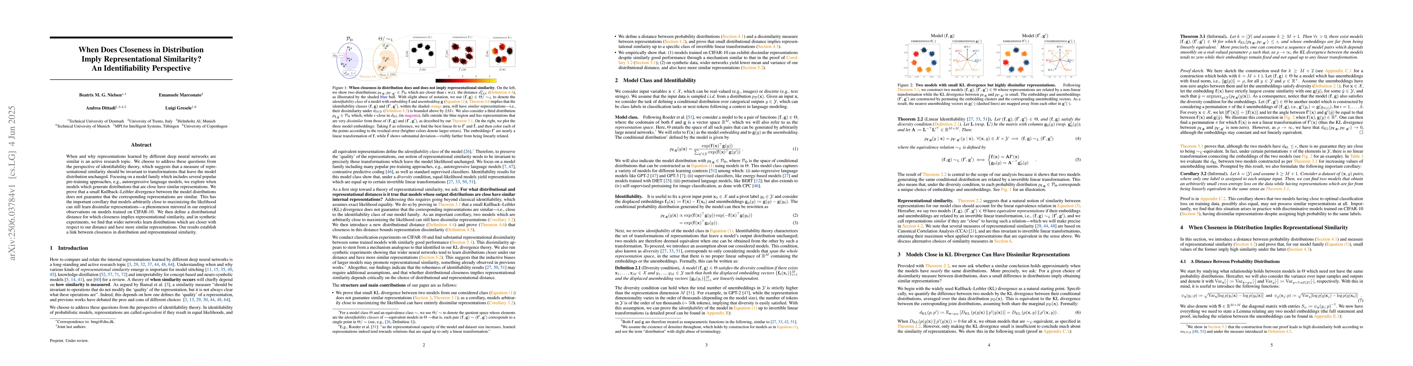 When and why representations learned by different deep neural networks are similar is an active research topic. We choose to address these questions from the perspective of identifiability theory, which suggests that a measure of representational similarity should be invariant to transformations that leave the model distribution unchanged. Focusing on a model family which includes several popular pre-training approaches, e.g., autoregressive language models, we explore when models which generate distributions that are close have similar representations. We prove that a small Kullback-Leibler divergence between the model distributions does not guarantee that the corresponding representations are similar. This has the important corollary that models arbitrarily close to maximizing the likelihood can still learn dissimilar representations, a phenomenon mirrored in our empirical observations on models trained on CIFAR-10. We then define a distributional distance for which closeness implies representational similarity, and in synthetic experiments, we find that wider networks learn distributions which are closer with respect to our distance and have more similar representations. Our results establish a link between closeness in distribution and representational similarity.