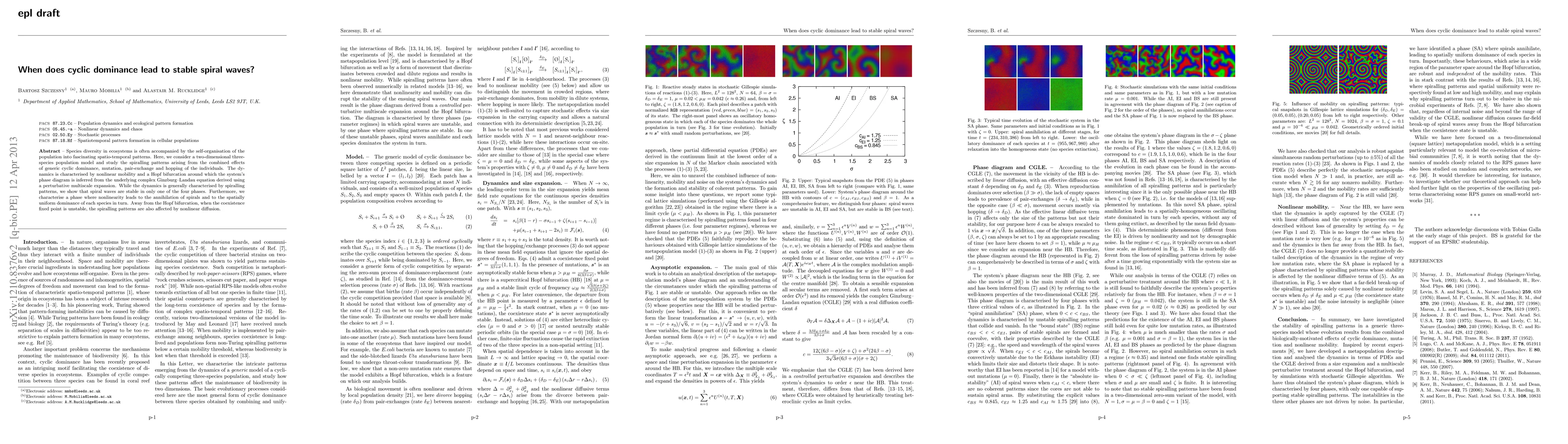 Species diversity in ecosystems is often accompanied by the self-organisation of the population into fascinating spatio-temporal patterns. Here, we consider a two-dimensional three-species population model and study the spiralling patterns arising from the combined effects of generic cyclic dominance, mutation, pair-exchange and hopping of the individuals. The dynamics is characterised by nonlinear mobility and a Hopf bifurcation around which the system's phase diagram is inferred from the underlying complex Ginzburg-Landau equation derived using a perturbative multiscale expansion. While the dynamics is generally characterised by spiralling patterns, we show that spiral waves are stable in only one of the four phases. Furthermore, we characterise a phase where nonlinearity leads to the annihilation of spirals and to the spatially uniform dominance of each species in turn. Away from the Hopf bifurcation, when the coexistence fixed point is unstable, the spiralling patterns are also affected by nonlinear diffusion.