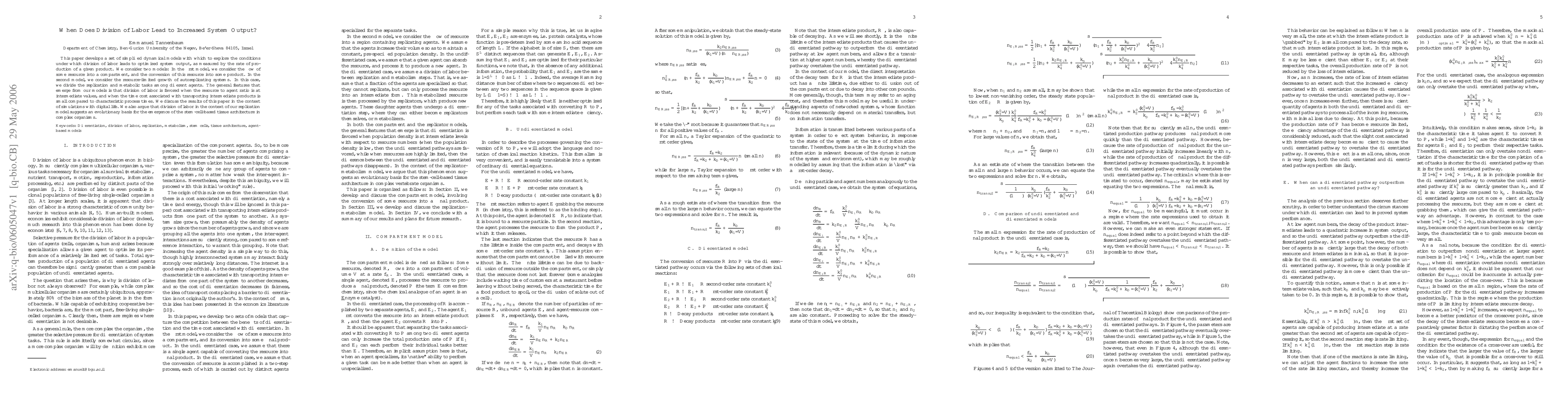 This paper explores conditions under which division of labor optimizes system output, using simplified dynamical models for resource conversion and autoreplicating systems. It finds that intermediate resource-to-agent ratios and low transport costs favor division of labor, with implications for evolutionary biology and digital life simulations.