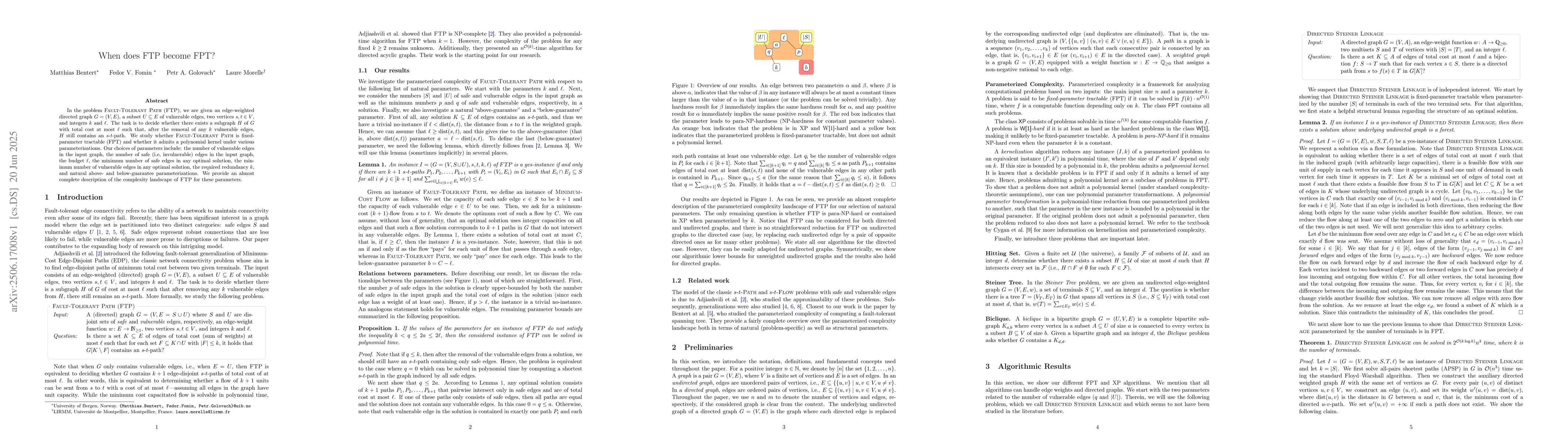 This research explores the computational complexity of the Fault-Tolerant Path (FTP) problem, determining its fixed-parameter tractability (FPT) and polynomial kernel properties under various parameterizations. It provides an extensive classification of FTP's complexity across different parameters, including vulnerable and safe edges, budget, redundancy, and guarantee parameters.