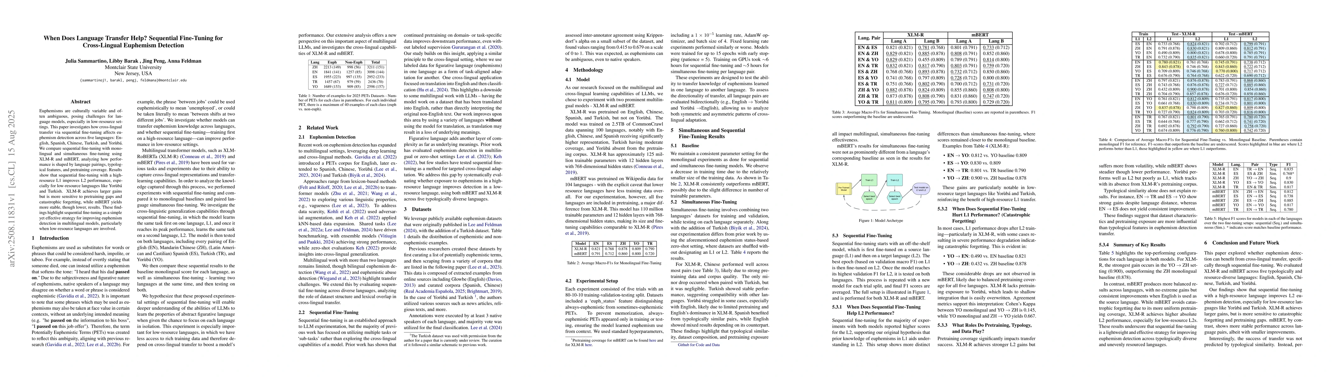 Euphemisms are culturally variable and often ambiguous, posing challenges for language models, especially in low-resource settings. This paper investigates how cross-lingual transfer via sequential fine-tuning affects euphemism detection across five languages: English, Spanish, Chinese, Turkish, and Yoruba. We compare sequential fine-tuning with monolingual and simultaneous fine-tuning using XLM-R and mBERT, analyzing how performance is shaped by language pairings, typological features, and pretraining coverage. Results show that sequential fine-tuning with a high-resource L1 improves L2 performance, especially for low-resource languages like Yoruba and Turkish. XLM-R achieves larger gains but is more sensitive to pretraining gaps and catastrophic forgetting, while mBERT yields more stable, though lower, results. These findings highlight sequential fine-tuning as a simple yet effective strategy for improving euphemism detection in multilingual models, particularly when low-resource languages are involved.