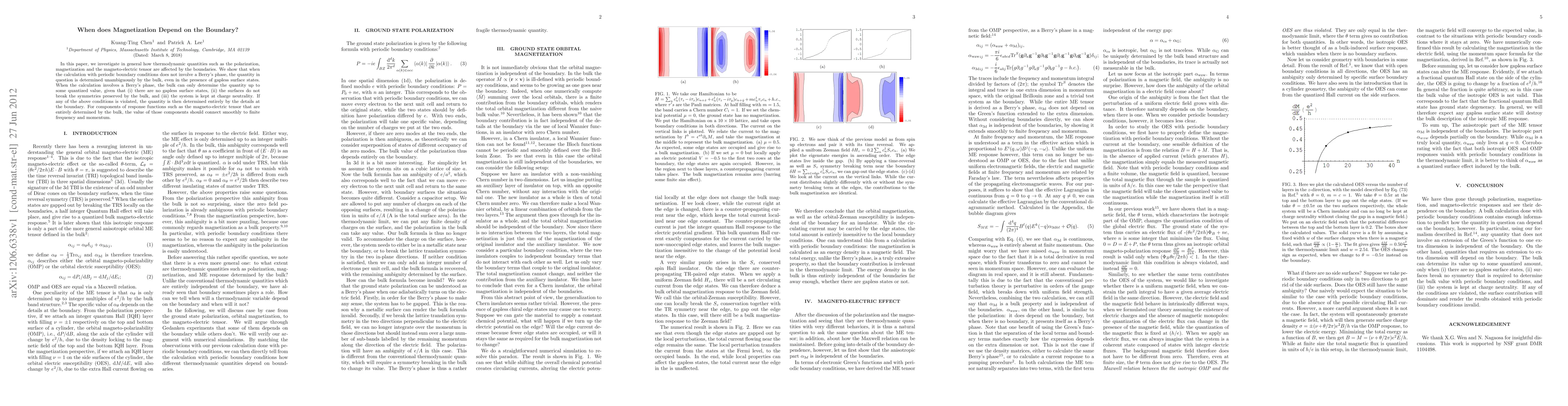 In this paper, we investigate in general how thermodynamic quantities such as the polarization, magnetization and the magneto-electric tensor are affected by the boundaries. We show that when the calculation with periodic boundary conditions does not involve a Berry's phase, the quantity in question is determined unambiguously by the bulk, even in the presence of gapless surface states. When the calculation involves a Berry's phase, the bulk can only determine the quantity up to some quantized value, given that (i) there are no gapless surface states, (ii) the surfaces do not break the symmetries preserved by the bulk, and (iii) the system is kept at charge neutrality. If any of the above conditions is violated, the quantity is then determined entirely by the details at the boundary. For components of response functions such as the magneto-electric tensor that are entirely determined by the bulk, the value of those components should connect smoothly to finite frequency and momentum.