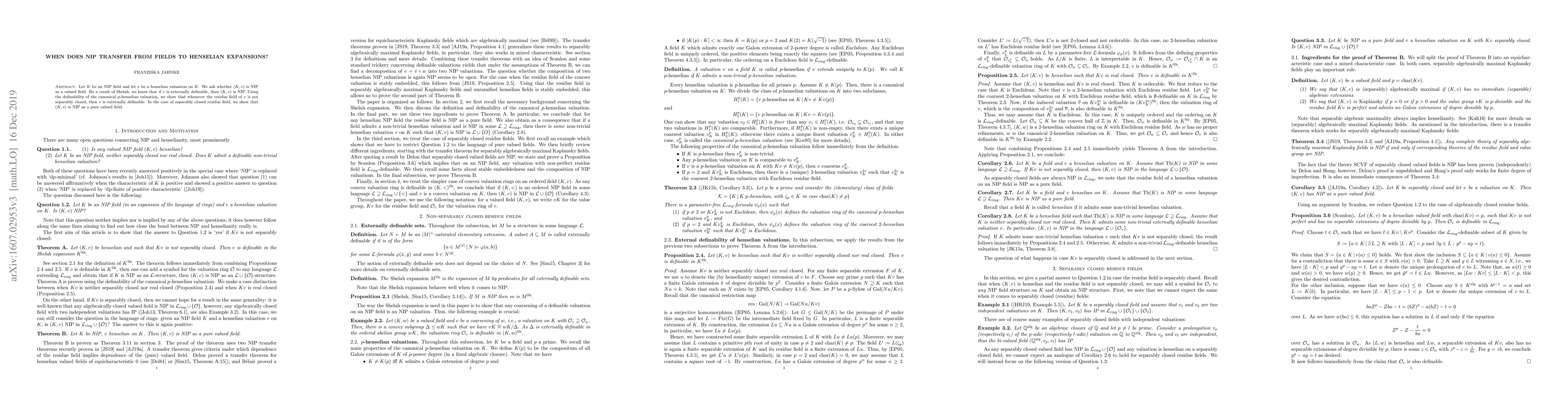 This paper investigates whether the NIP (not having an independence property) property in fields transfers to their henselian expansions. It demonstrates that if a henselian valuation on an NIP field has a non-separably closed residue field, the valuation is externally definable, thus maintaining the NIP property. For separably closed residue fields, the paper shows that the valued field still retains the NIP property in its pure form.