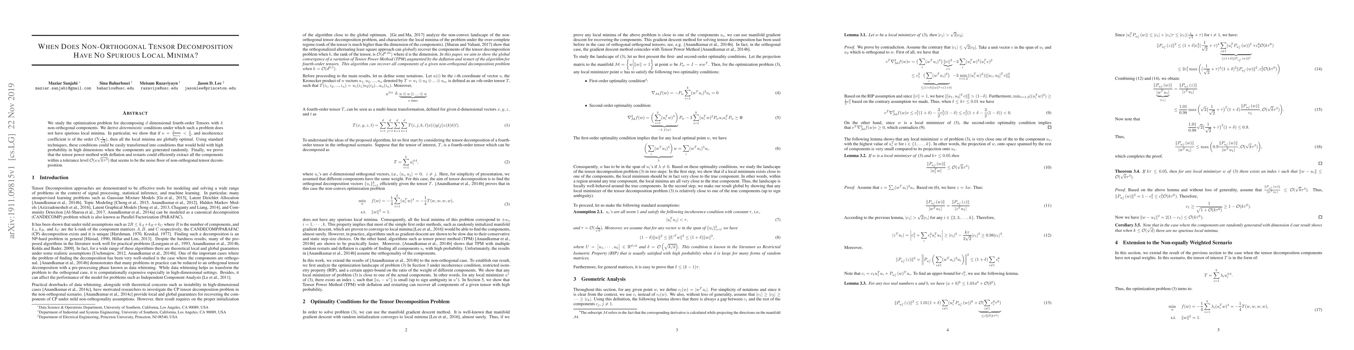We study the optimization problem for decomposing $d$ dimensional fourth-order Tensors with $k$ non-orthogonal components. We derive \textit{deterministic} conditions under which such a problem does not have spurious local minima. In particular, we show that if $\kappa = \frac{\lambda_{max}}{\lambda_{min}} < \frac{5}{4}$, and incoherence coefficient is of the order $O(\frac{1}{\sqrt{d}})$, then all the local minima are globally optimal. Using standard techniques, these conditions could be easily transformed into conditions that would hold with high probability in high dimensions when the components are generated randomly. Finally, we prove that the tensor power method with deflation and restarts could efficiently extract all the components within a tolerance level $O(\kappa \sqrt{k\tau^3})$ that seems to be the noise floor of non-orthogonal tensor decomposition.