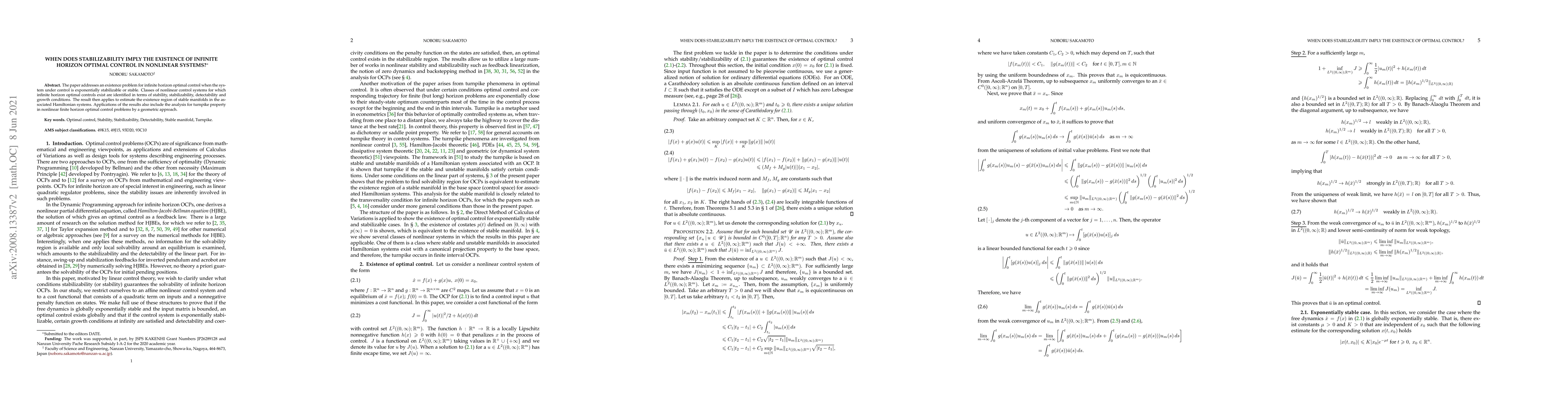 The paper identifies conditions under which stabilizability implies the existence of infinite horizon optimal control in nonlinear systems, focusing on stability, stabilizability, detectability, and growth conditions. It also applies these findings to estimate the existence region of stable manifolds and analyze the turnpike property in nonlinear finite horizon optimal control.