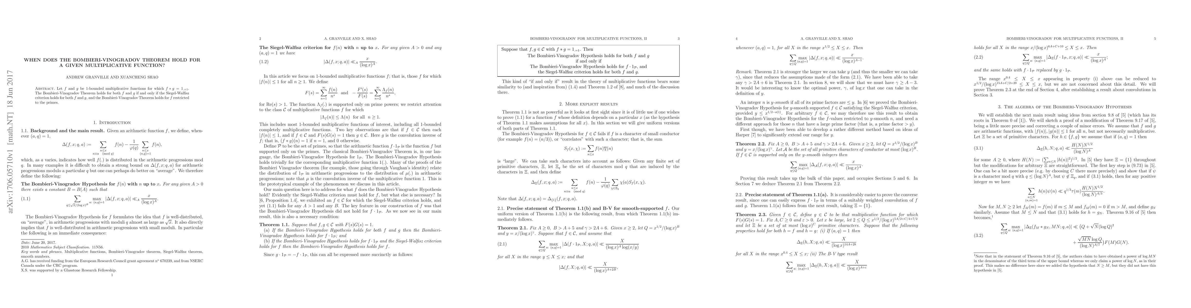 Summary: The Bombieri-Vinogradov Theorem applies to 1-bounded multiplicative functions $f$ and $g$ if and only if the Siegel-Walfisz criterion is satisfied for both, and the theorem holds for $f$ restricted to primes.