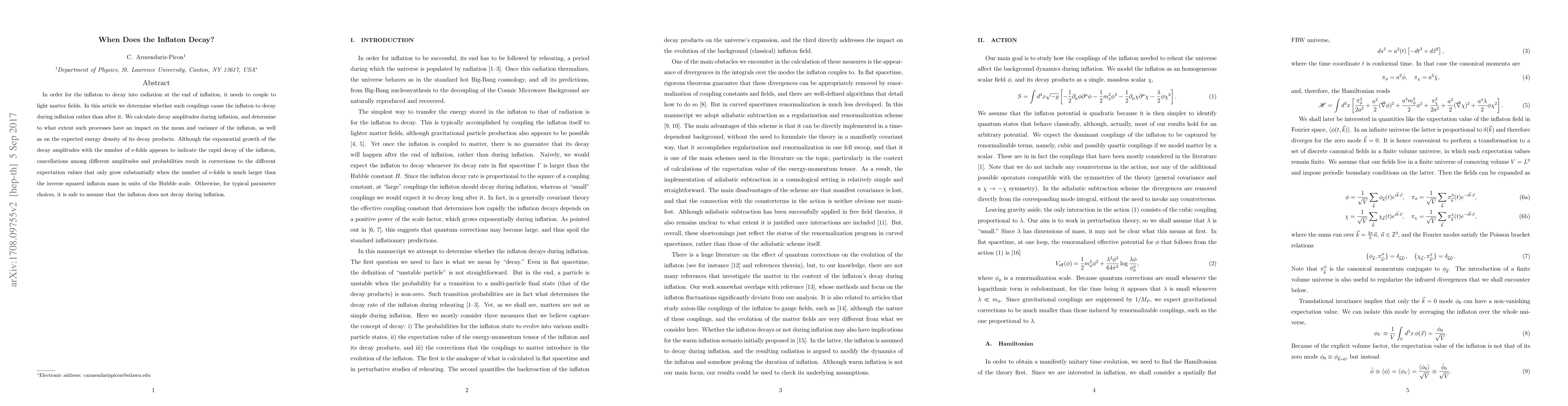 This paper investigates whether the inflaton decays during inflation or afterward by coupling to light matter fields, finding that while decay amplitudes grow exponentially with e-folds, cancellations among amplitudes mean the inflaton typically does not decay during inflation unless the number of e-folds is significantly larger than the inverse squared inflaton mass relative to the Hubble scale.