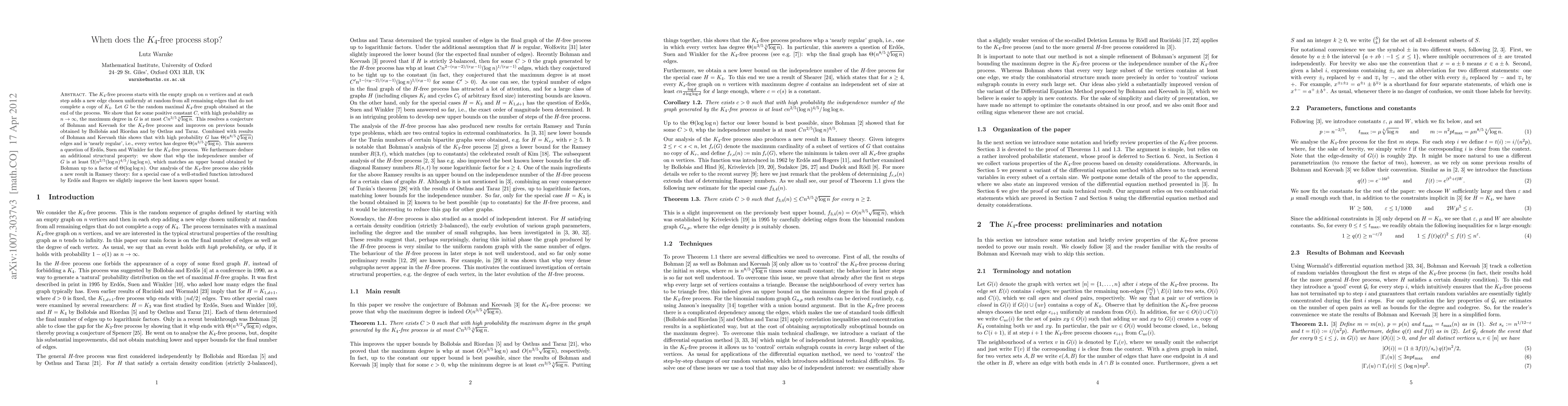The K_4-free process creates a graph with high probability that is nearly regular, meaning every vertex has a similar number of edges, and the maximum degree of the graph grows polynomially with the size of the input.