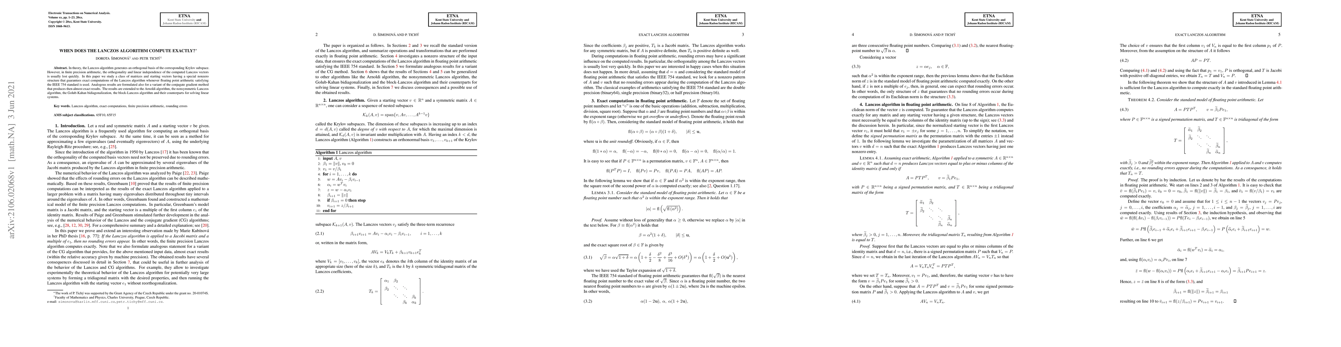 In theory, the Lanczos algorithm generates an orthogonal basis of the corresponding Krylov subspace. However, in finite precision arithmetic, the orthogonality and linear independence of the computed Lanczos vectors is usually lost quickly. In this paper we study a class of matrices and starting vectors having a special nonzero structure that guarantees exact computations of the Lanczos algorithm whenever floating point arithmetic satisfying the IEEE 754 standard is used. Analogous results are formulated also for a variant of the conjugate gradient method that produces then almost exact results. The results are extended to the Arnoldi algorithm, the nonsymmetric Lanczos algorithm, the Golub-Kahan bidiagonalization, the block-Lanczos algorithm and their counterparts for solving linear systems.