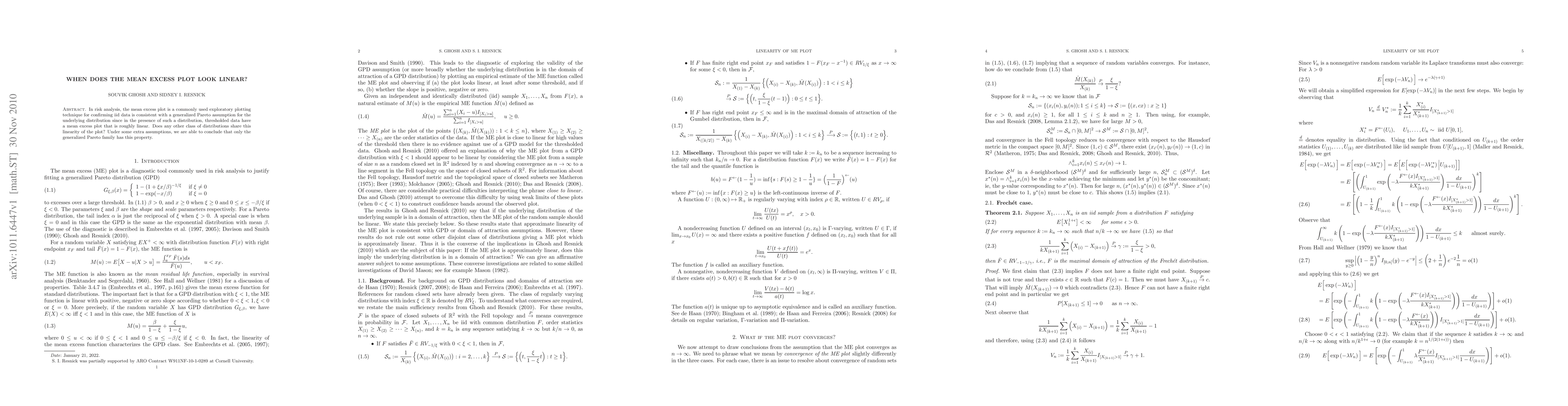 In risk analysis, the mean excess plot is a commonly used exploratory plotting technique for confirming iid data is consistent with a generalized Pareto assumption for the underlying distribution, since in the presence of such a distribution thresholded data have a mean excess plot that is roughly linear. Does any other class of distributions share this linearity of the plot? Under some extra assumptions, we are able to conclude that only the generalized Pareto family has this property.