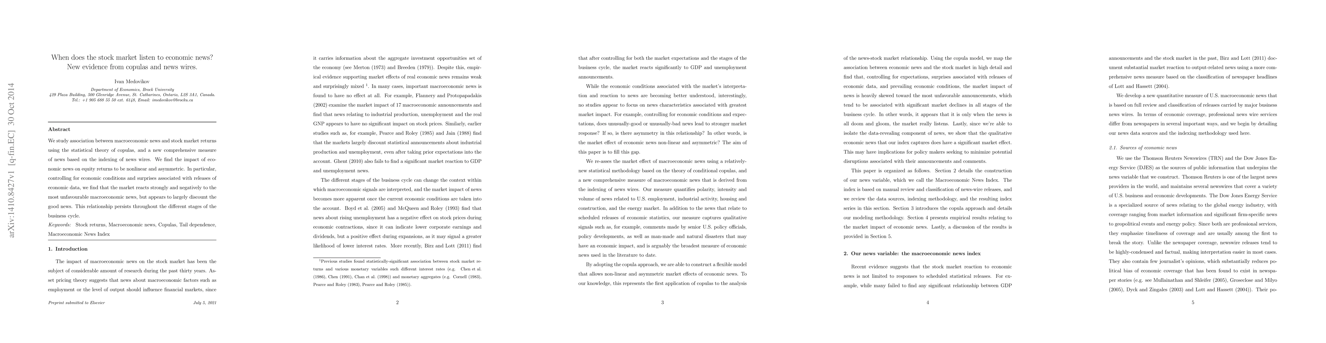 This paper uses copulas and a new news index to examine how macroeconomic news affects stock market returns, finding a nonlinear and asymmetric relationship where the market reacts strongly to unfavorable news but largely ignores positive news, regardless of the business cycle stage.