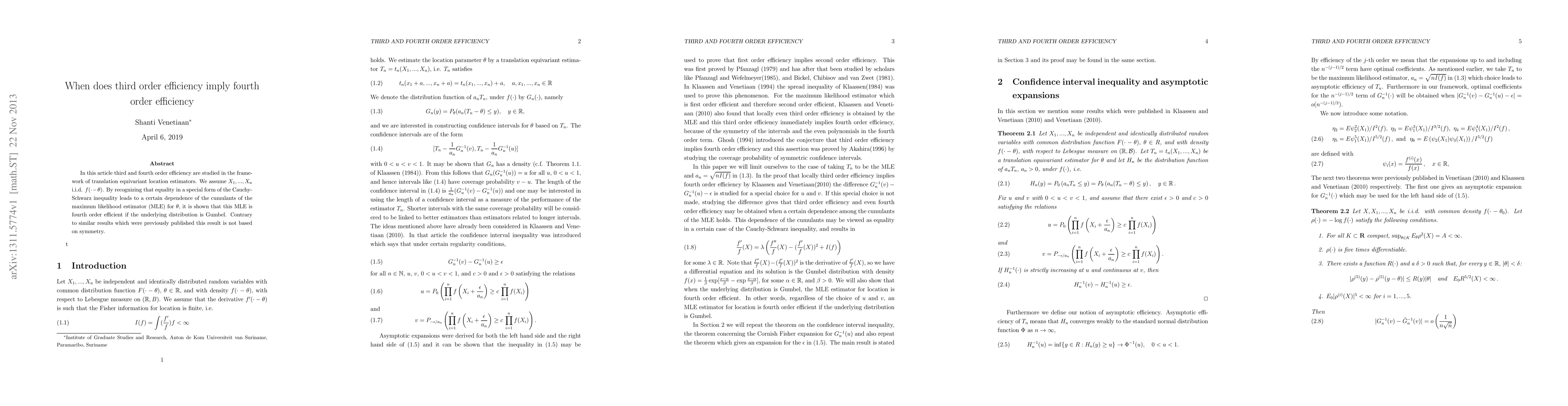 This paper investigates conditions under which third order efficiency implies fourth order efficiency for translation equivariant location estimators. It demonstrates that the maximum likelihood estimator achieves fourth order efficiency under a Gumbel distribution, relying on a specific form of the Cauchy-Schwarz inequality rather than symmetry.