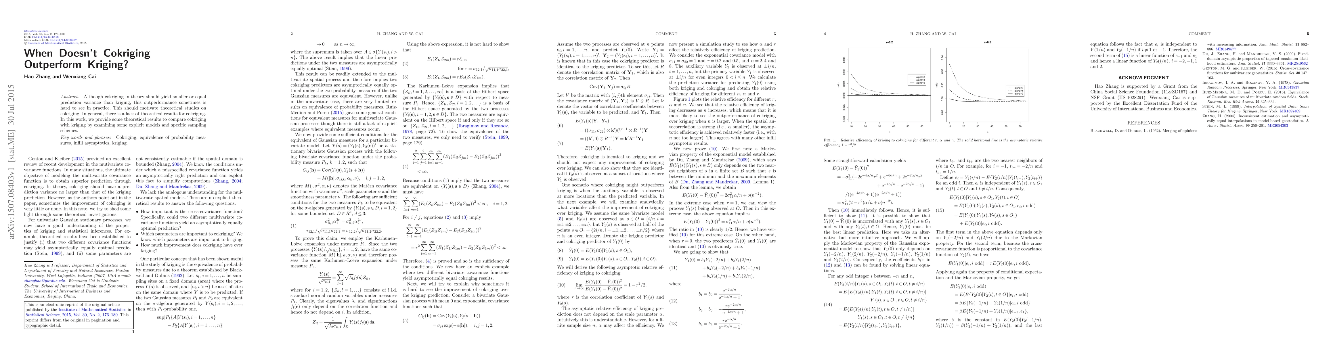 Although cokriging in theory should yield smaller or equal prediction variance than kriging, this outperformance sometimes is hard to see in practice. This should motivate theoretical studies on cokriging. In general, there is a lack of theoretical results for cokriging. In this work, we provide some theoretical results to compare cokriging with kriging by examining some explicit models and specific sampling schemes. [arXiv:1507.08017]
