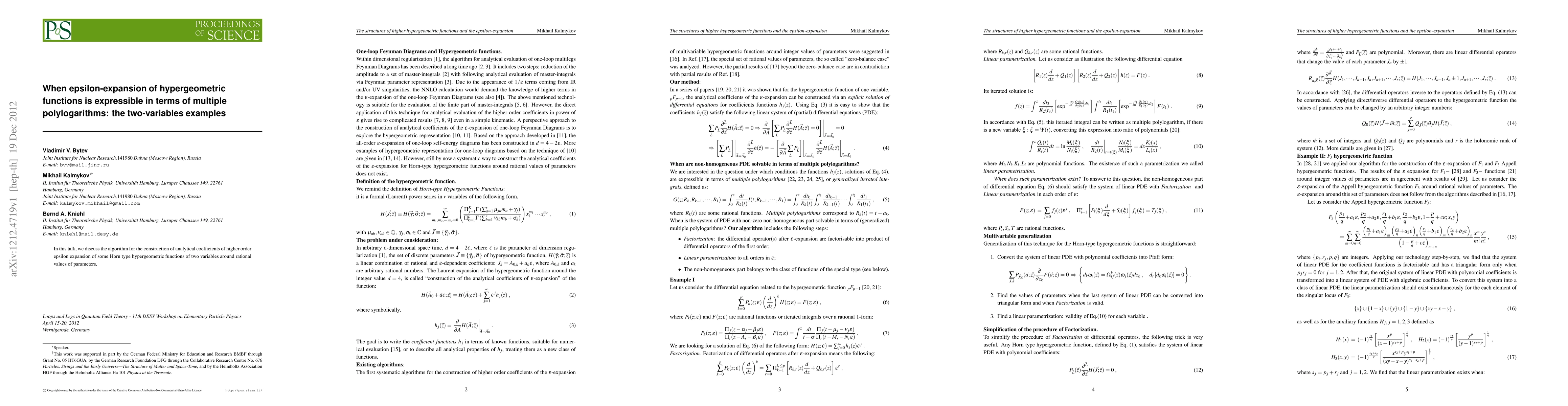 In this talk, we discuss the algorithm for the construction of analytical coefficients of higher order epsilon expansion of some Horn type hypergeometric functions of two variables around rational values of parameters.