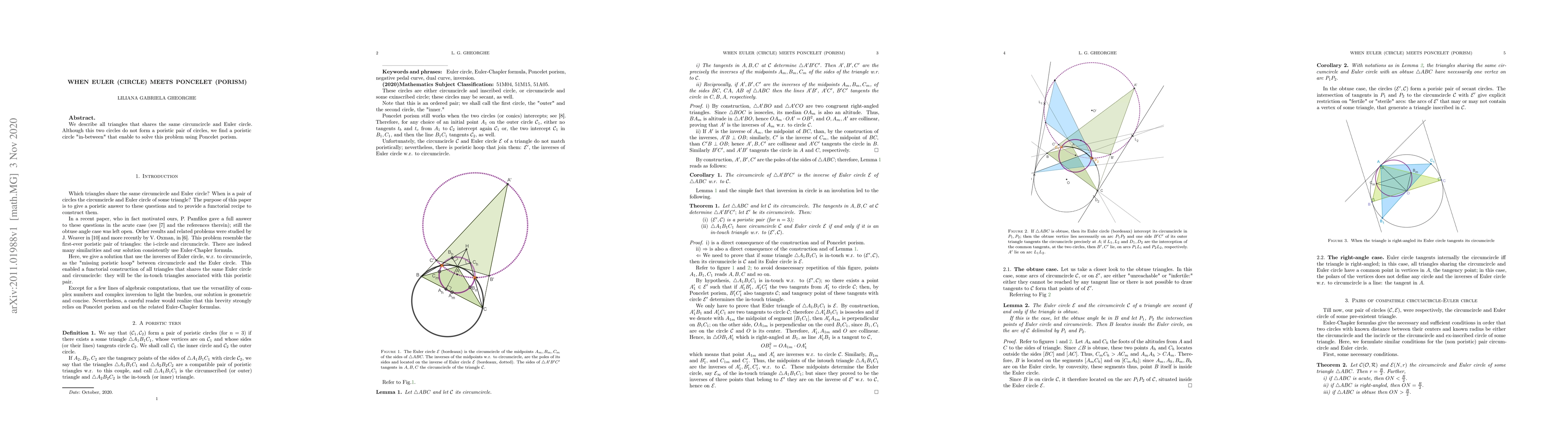 We describe all triangles that shares the same circumcircle and Euler circle. Although this two circles do not form a poristic pair of circles, we find a poristic circle "in-between" that enable to solve this problem using Poncelet porism.