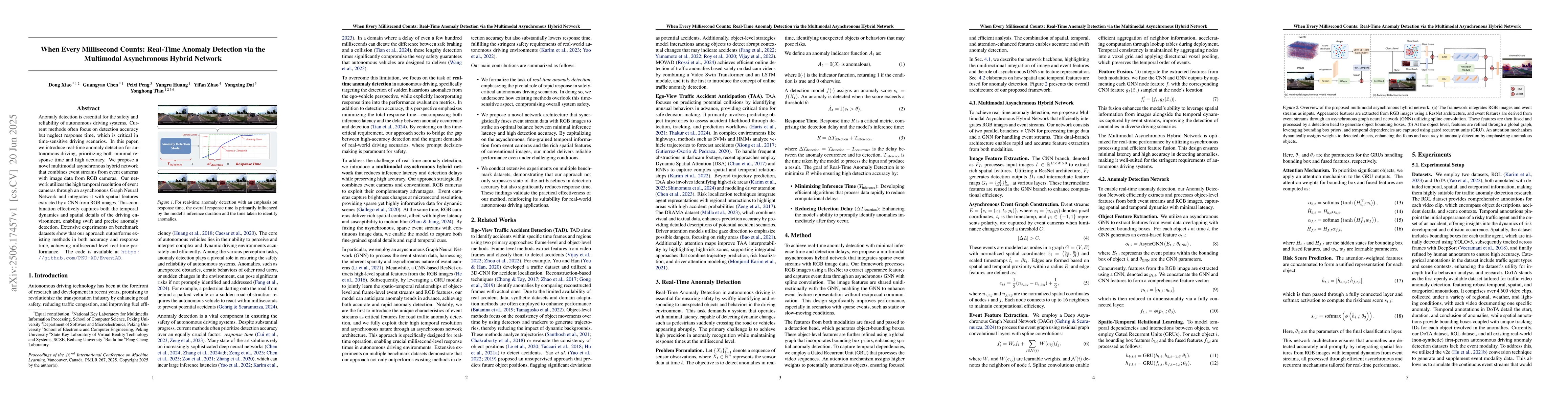 Anomaly detection is essential for the safety and reliability of autonomous driving systems. Current methods often focus on detection accuracy but neglect response time, which is critical in time-sensitive driving scenarios. In this paper, we introduce real-time anomaly detection for autonomous driving, prioritizing both minimal response time and high accuracy. We propose a novel multimodal asynchronous hybrid network that combines event streams from event cameras with image data from RGB cameras. Our network utilizes the high temporal resolution of event cameras through an asynchronous Graph Neural Network and integrates it with spatial features extracted by a CNN from RGB images. This combination effectively captures both the temporal dynamics and spatial details of the driving environment, enabling swift and precise anomaly detection. Extensive experiments on benchmark datasets show that our approach outperforms existing methods in both accuracy and response time, achieving millisecond-level real-time performance.
